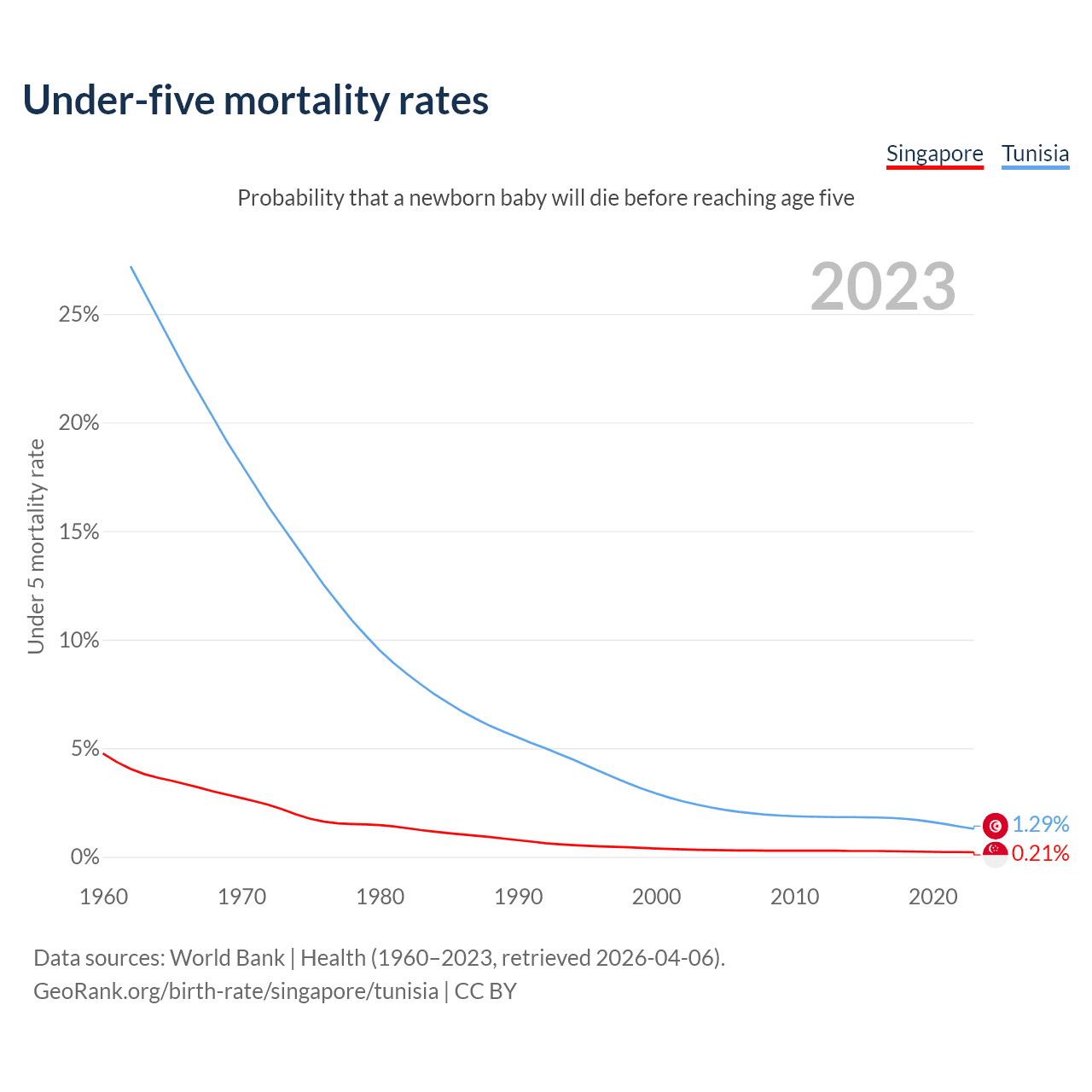 The chance that a newborn baby will die before reaching age five is 0.21% in Singapore and 1.29% in Tunisia. Above is a chart with historical data on under-five mortality rates.