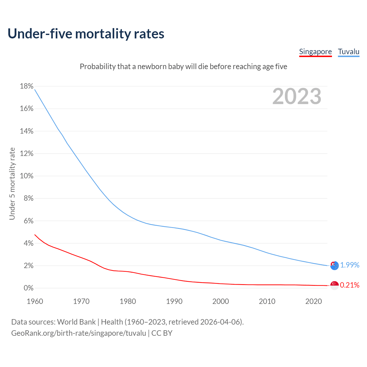 The chance that a newborn baby will die before reaching age five is 0.21% in Singapore and 1.99% in Tuvalu. Above is a chart with historical data on under-five mortality rates.
