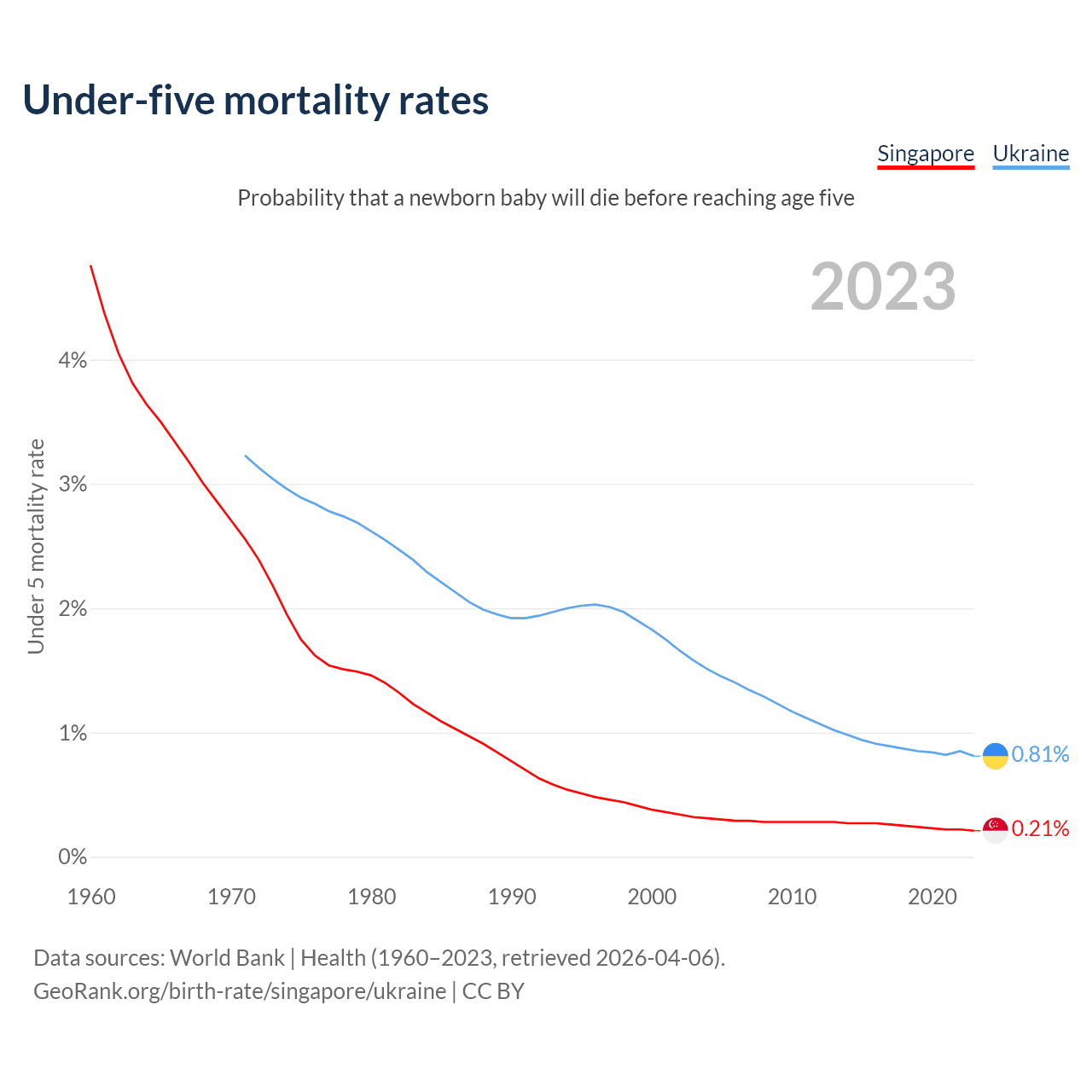 The chance that a newborn baby will die before reaching age five is 0.21% in Singapore and 0.81% in Ukraine. Above is a chart with historical data on under-five mortality rates.