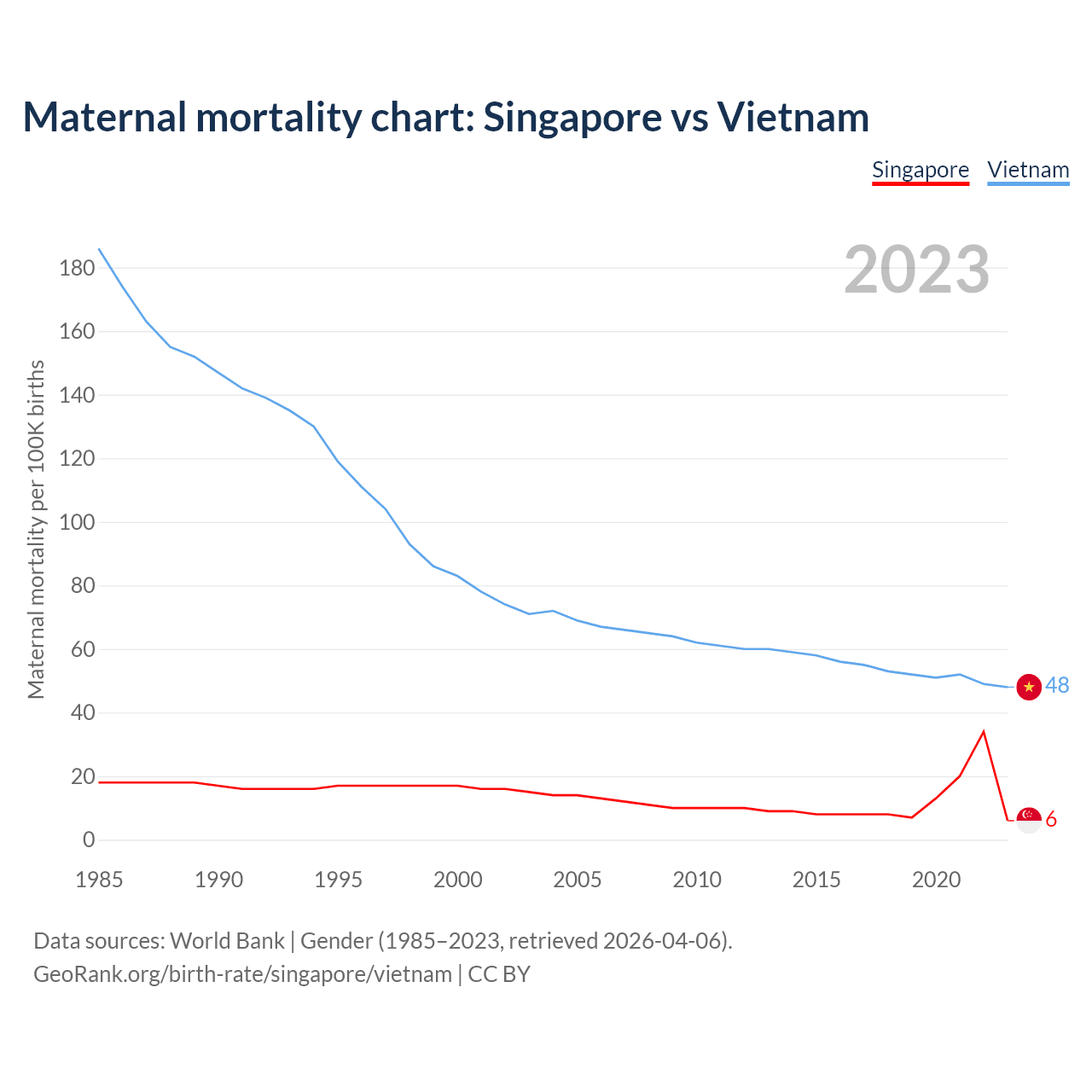 The maternal mortality rate, which is the probability of dying during childbirth or within 42 days of pregnancy termination, is 6 deaths per 100,000 live births in Singapore, compared to 48 deaths in Vietnam.