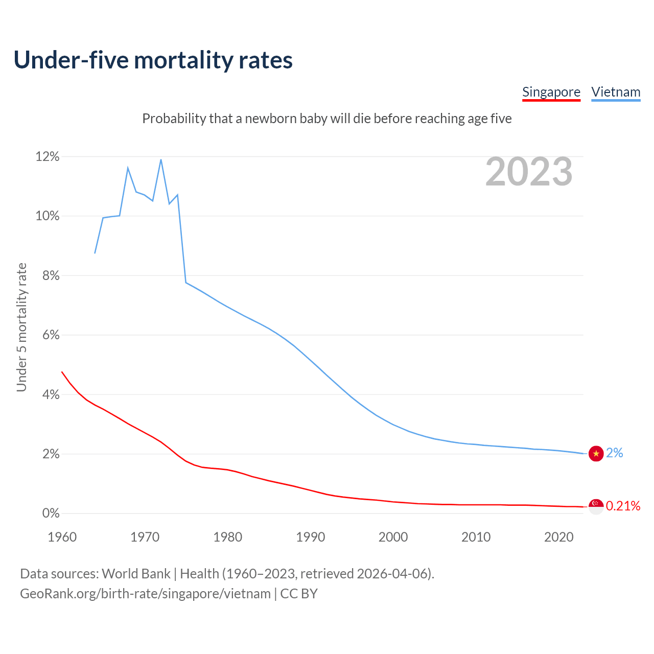 The chance that a newborn baby will die before reaching age five is 0.21% in Singapore and 2% in Vietnam. Above is a chart with historical data on under-five mortality rates.