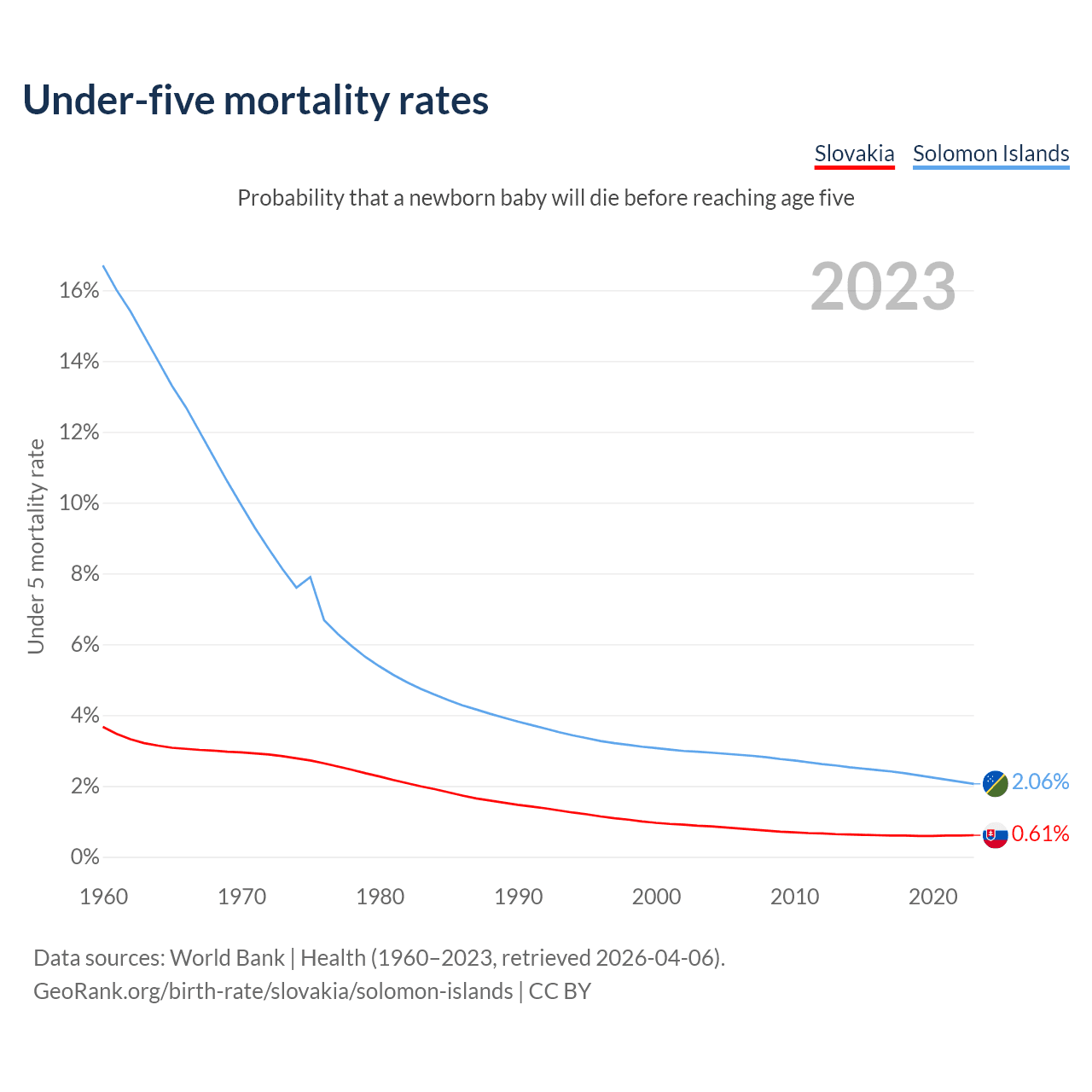 The chance that a newborn baby will die before reaching age five is 0.61% in Slovakia and 2.06% in the Solomon Islands. Above is a chart with historical data on under-five mortality rates.