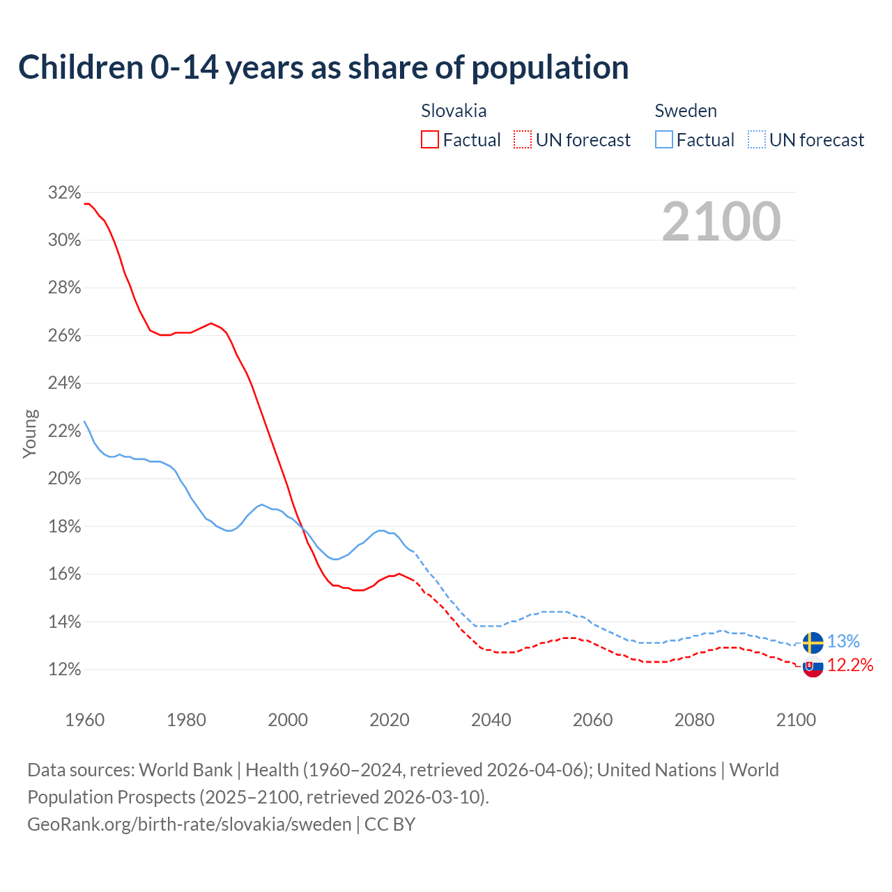 According to the latest available data on birth rates, the fertility rate in Slovakia was 1.49 children per woman in 2023, compared to 1.45 in Sweden in 2023. The replacement level is considered to be 2.1 children per woman.
