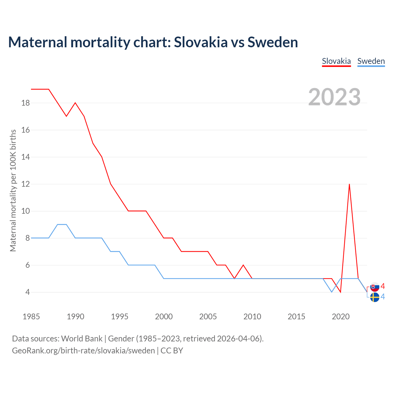 The maternal mortality rate, which is the probability of dying during childbirth or within 42 days of pregnancy termination, is 4 deaths per 100,000 live births in Slovakia, compared to 4 deaths in Sweden.