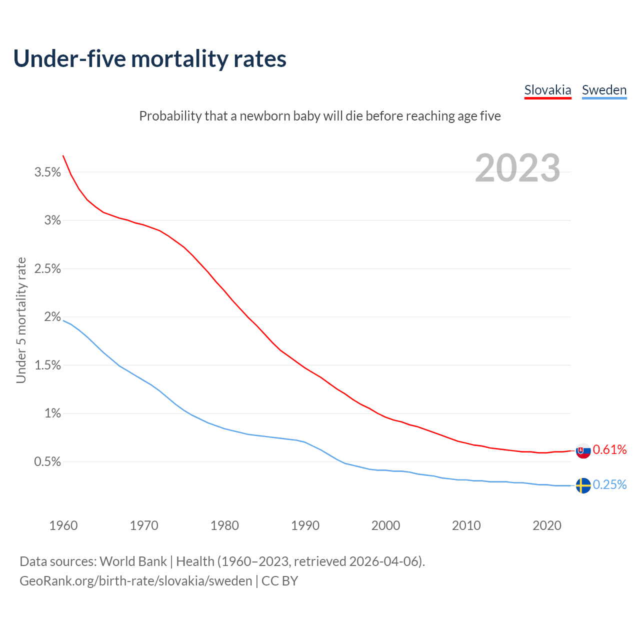 The chance that a newborn baby will die before reaching age five is 0.61% in Slovakia and 0.25% in Sweden. Above is a chart with historical data on under-five mortality rates.