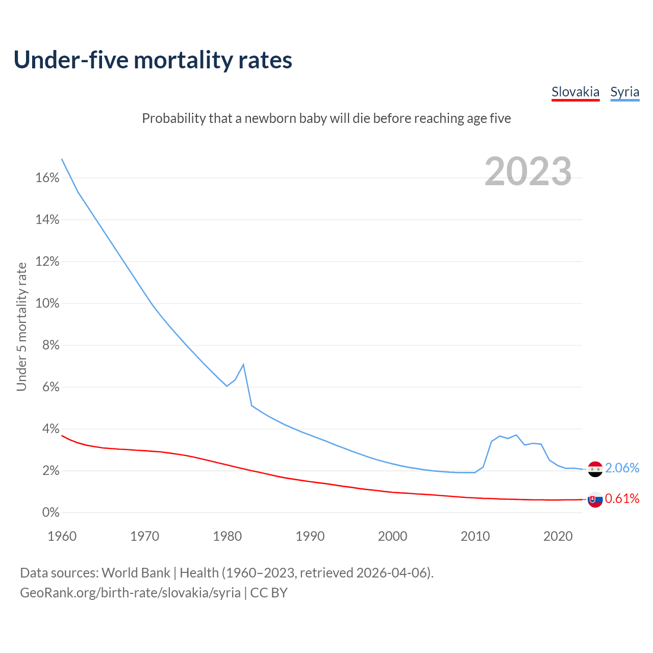 The chance that a newborn baby will die before reaching age five is 0.61% in Slovakia and 2.06% in Syria. Above is a chart with historical data on under-five mortality rates.