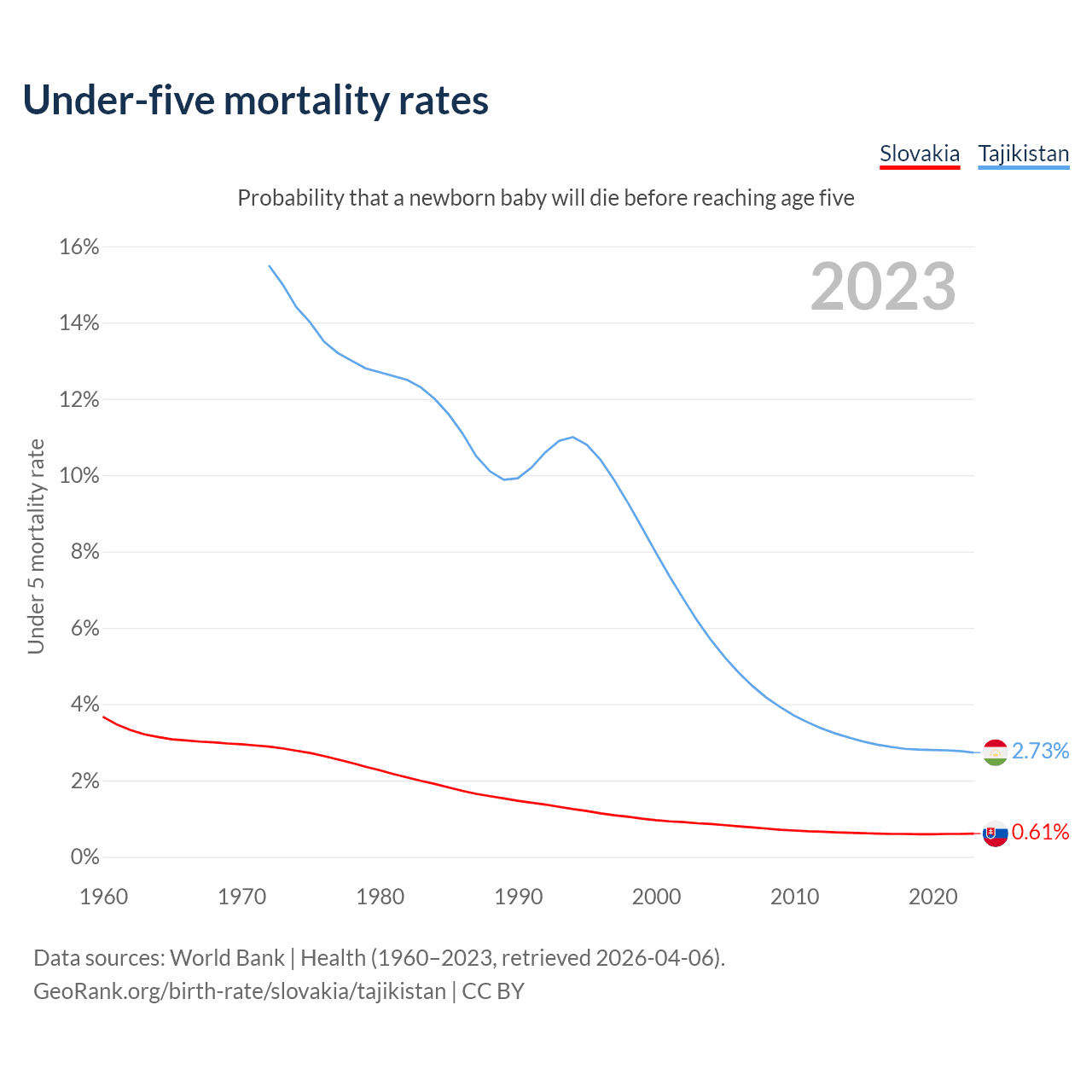 The chance that a newborn baby will die before reaching age five is 0.61% in Slovakia and 2.73% in Tajikistan. Above is a chart with historical data on under-five mortality rates.