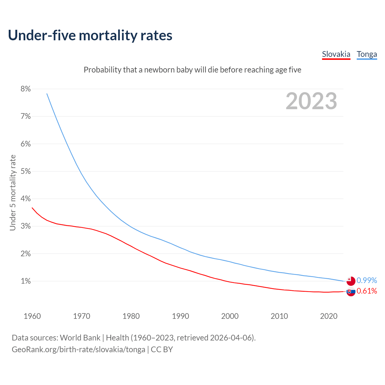 The chance that a newborn baby will die before reaching age five is 0.61% in Slovakia and 0.99% in Tonga. Above is a chart with historical data on under-five mortality rates.