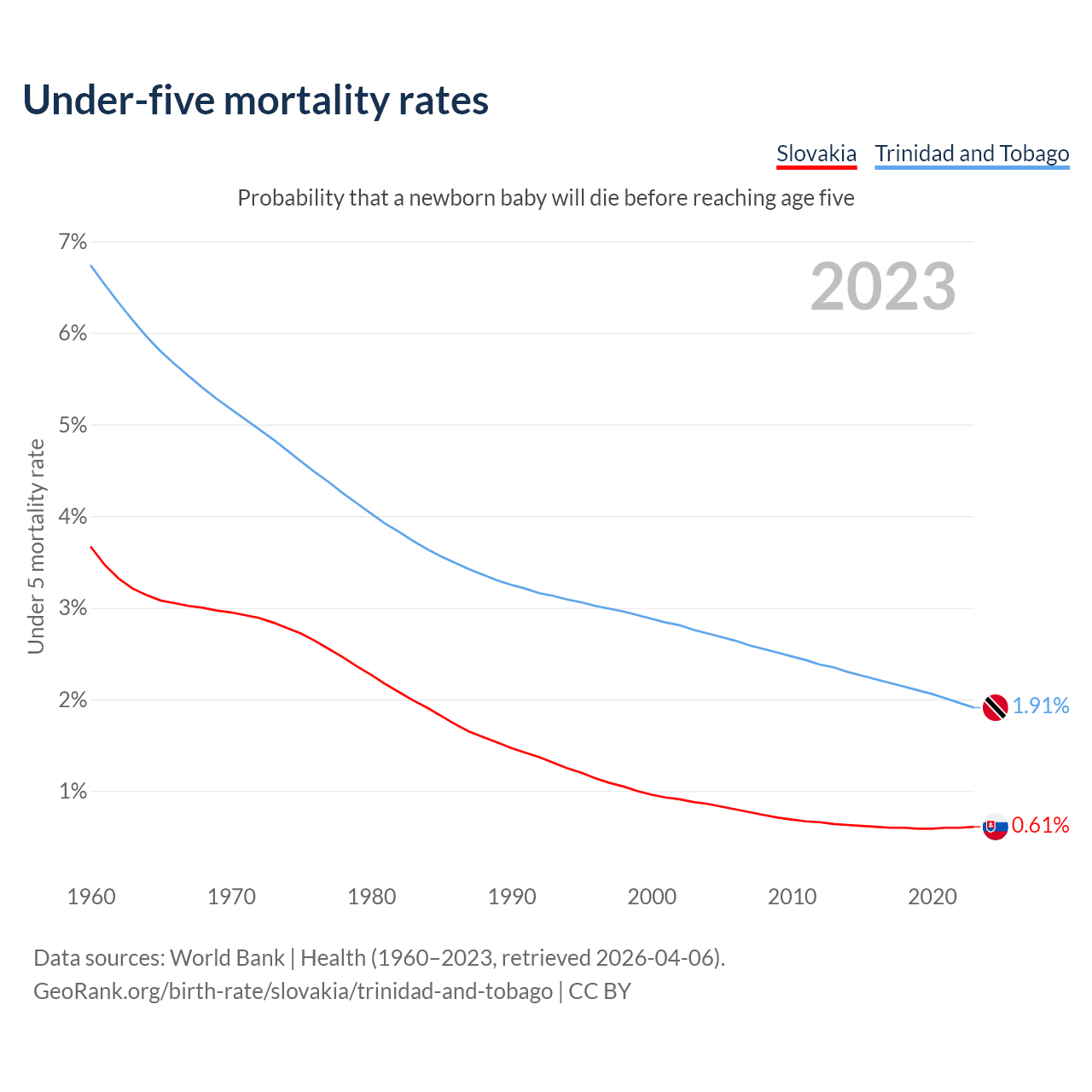 The chance that a newborn baby will die before reaching age five is 0.61% in Slovakia and 1.91% in Trinidad and Tobago. Above is a chart with historical data on under-five mortality rates.