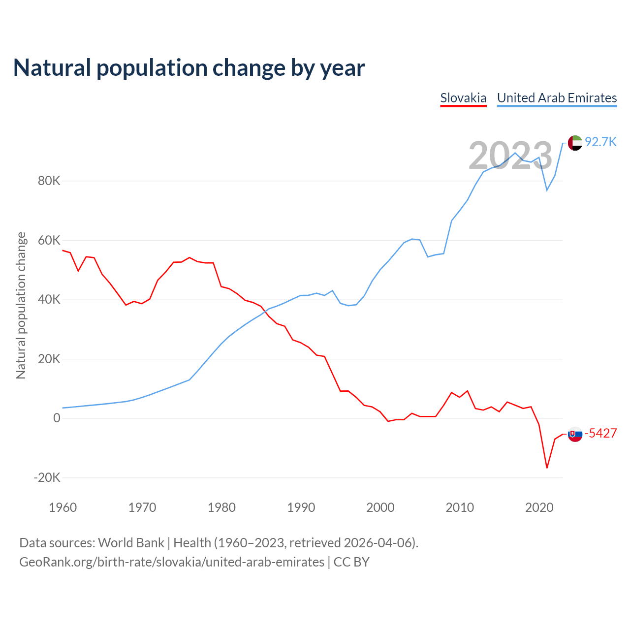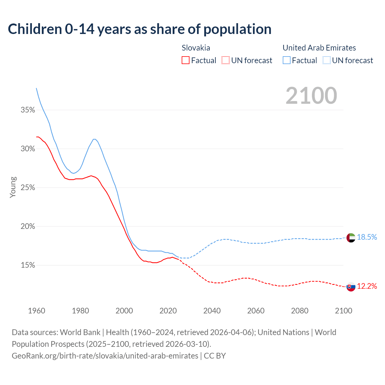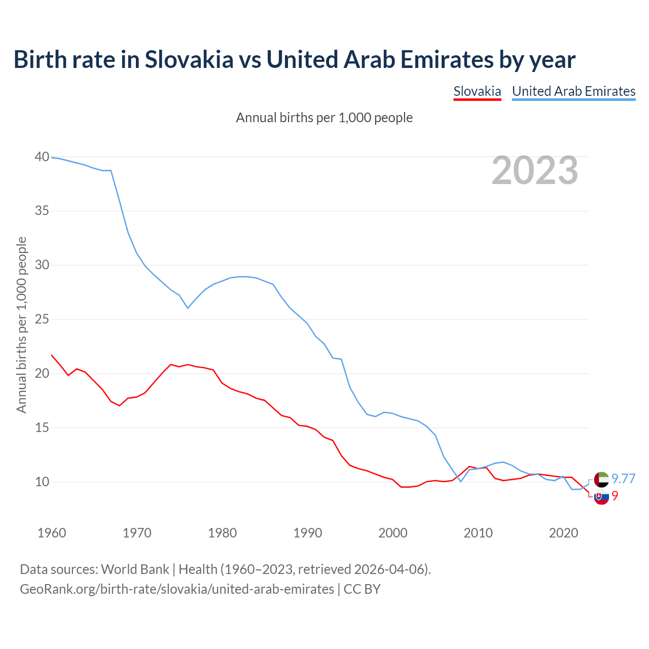Slovakia has an annual birth rate of 9 births per 1,000 people, compared to 9.77 for the United Arab Emirates. The average number of children a woman is expected to have during her lifetime — the fertility rate, is 1.49 in Slovakia and 1.2 in the United Arab Emirates — 19.5% difference.