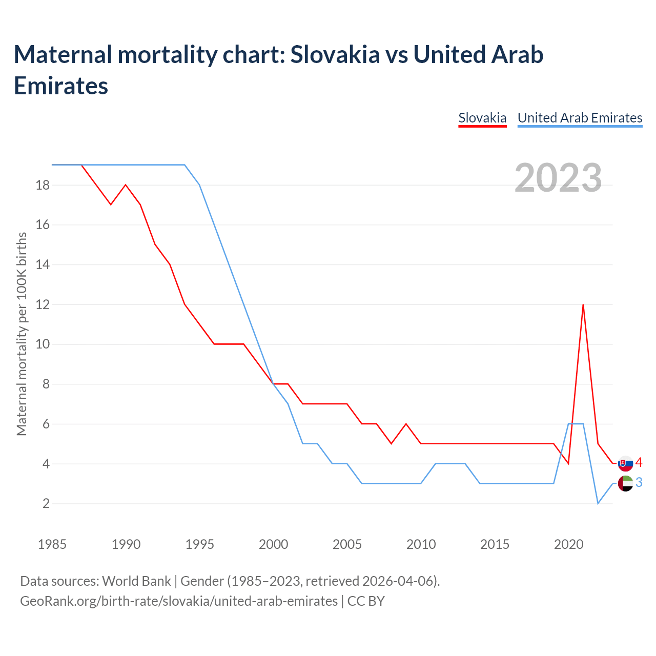 The maternal mortality rate, which is the probability of dying during childbirth or within 42 days of pregnancy termination, is 4 deaths per 100,000 live births in Slovakia, compared to 3 deaths in the United Arab Emirates.