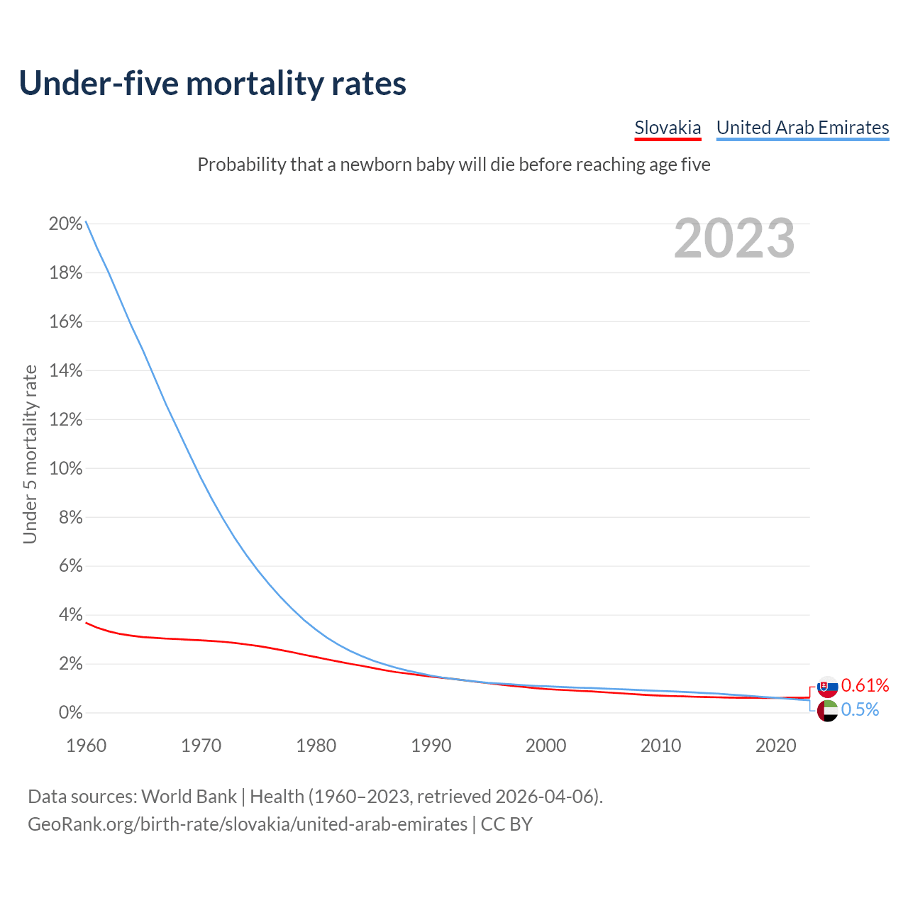 The chance that a newborn baby will die before reaching age five is 0.61% in Slovakia and 0.5% in the United Arab Emirates. Above is a chart with historical data on under-five mortality rates.