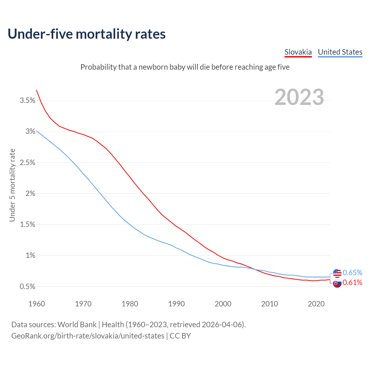 The chance that a newborn baby will die before reaching age five is 0.61% in Slovakia and 0.65% in the United States. Above is a chart with historical data on under-five mortality rates.