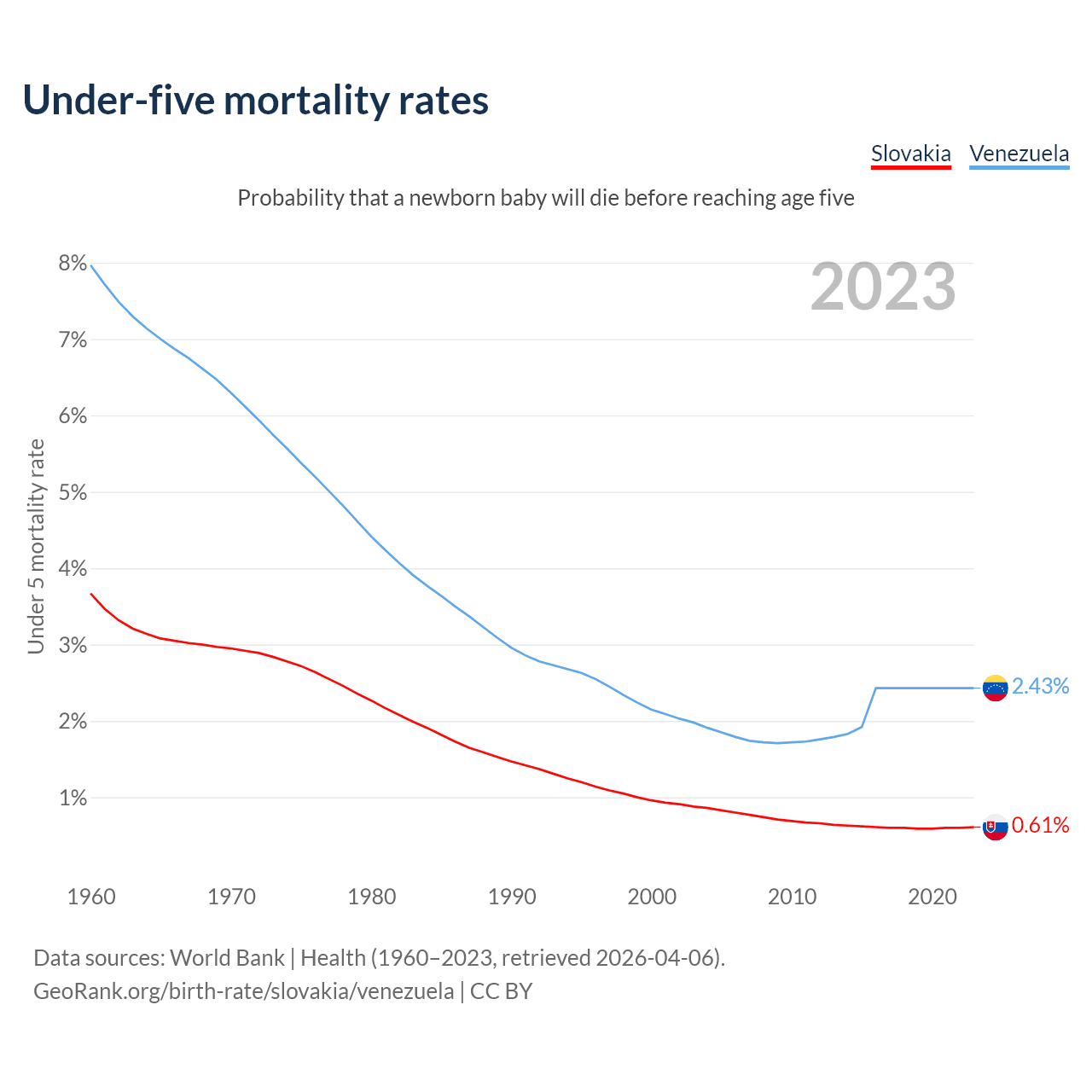 The chance that a newborn baby will die before reaching age five is 0.61% in Slovakia and 2.43% in Venezuela. Above is a chart with historical data on under-five mortality rates.
