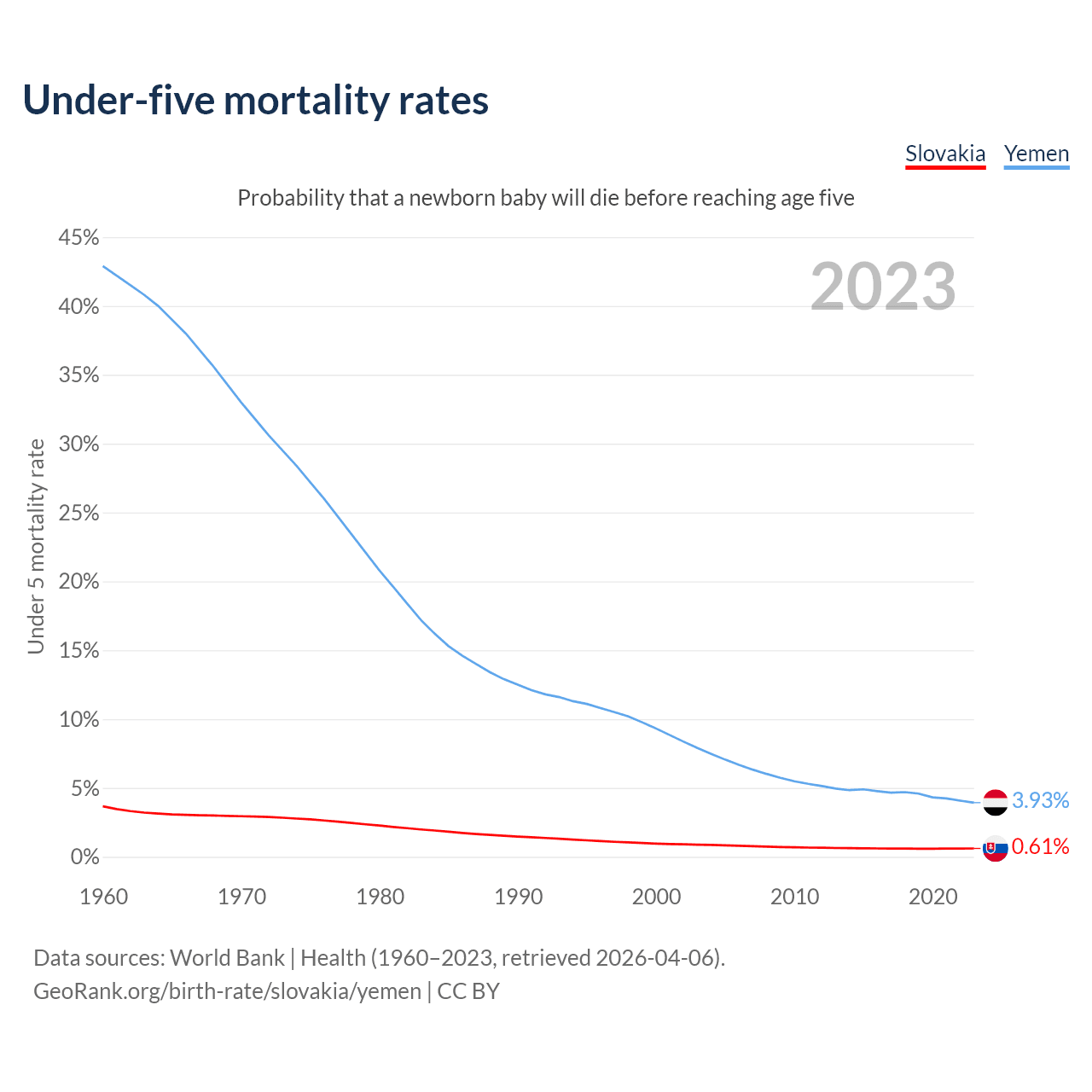 The chance that a newborn baby will die before reaching age five is 0.61% in Slovakia and 3.93% in Yemen. Above is a chart with historical data on under-five mortality rates.