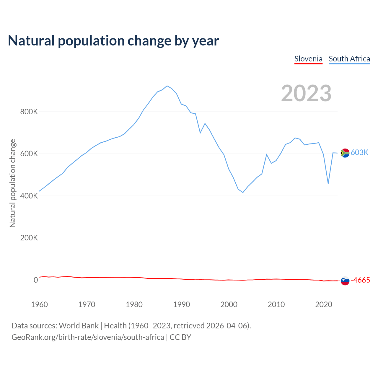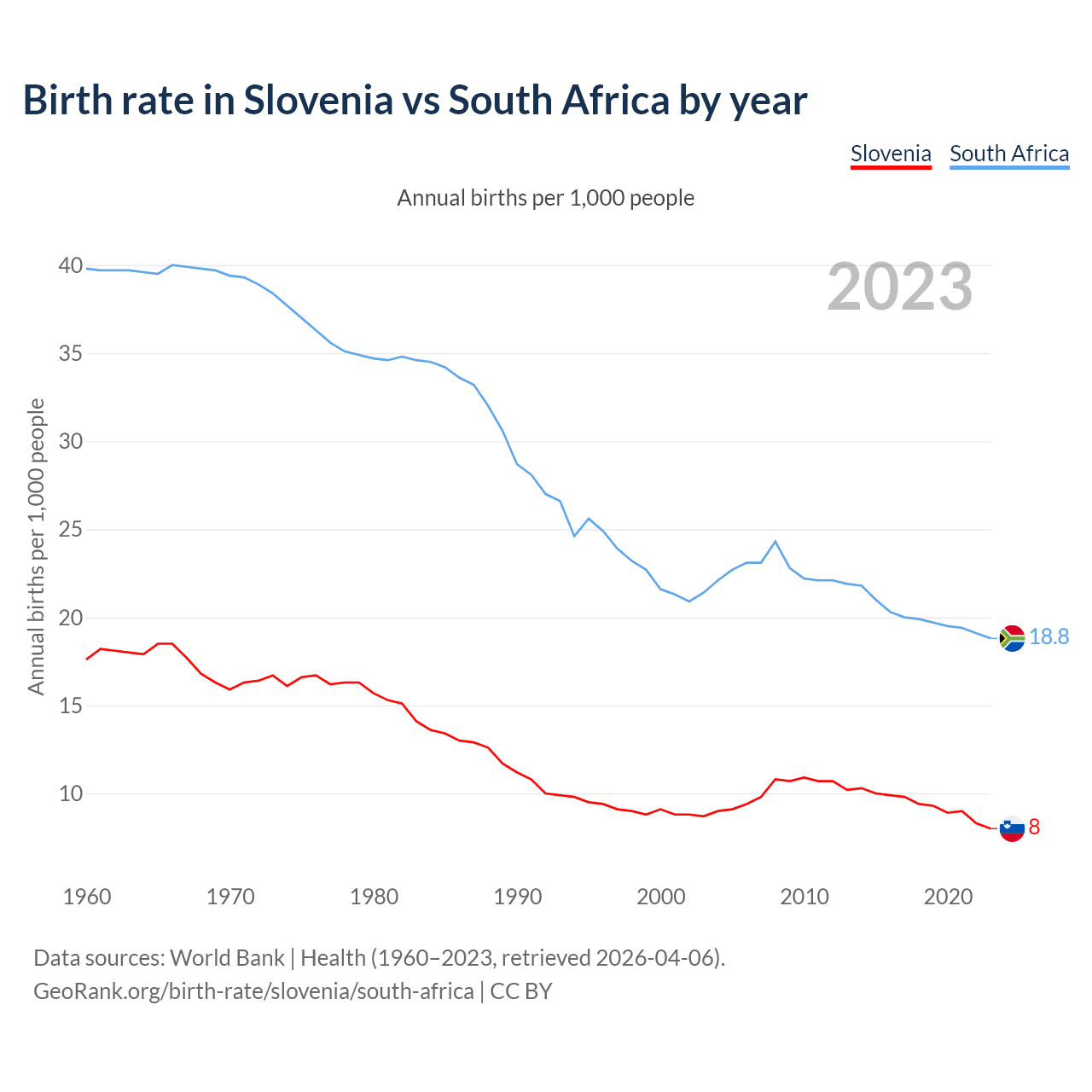 Slovenia has an annual birth rate of 8 births per 1,000 people, compared to 18.8 for South Africa. The average number of children a woman is expected to have during her lifetime — the fertility rate, is 1.51 in Slovenia and 2.22 in South Africa — 46.8% difference.