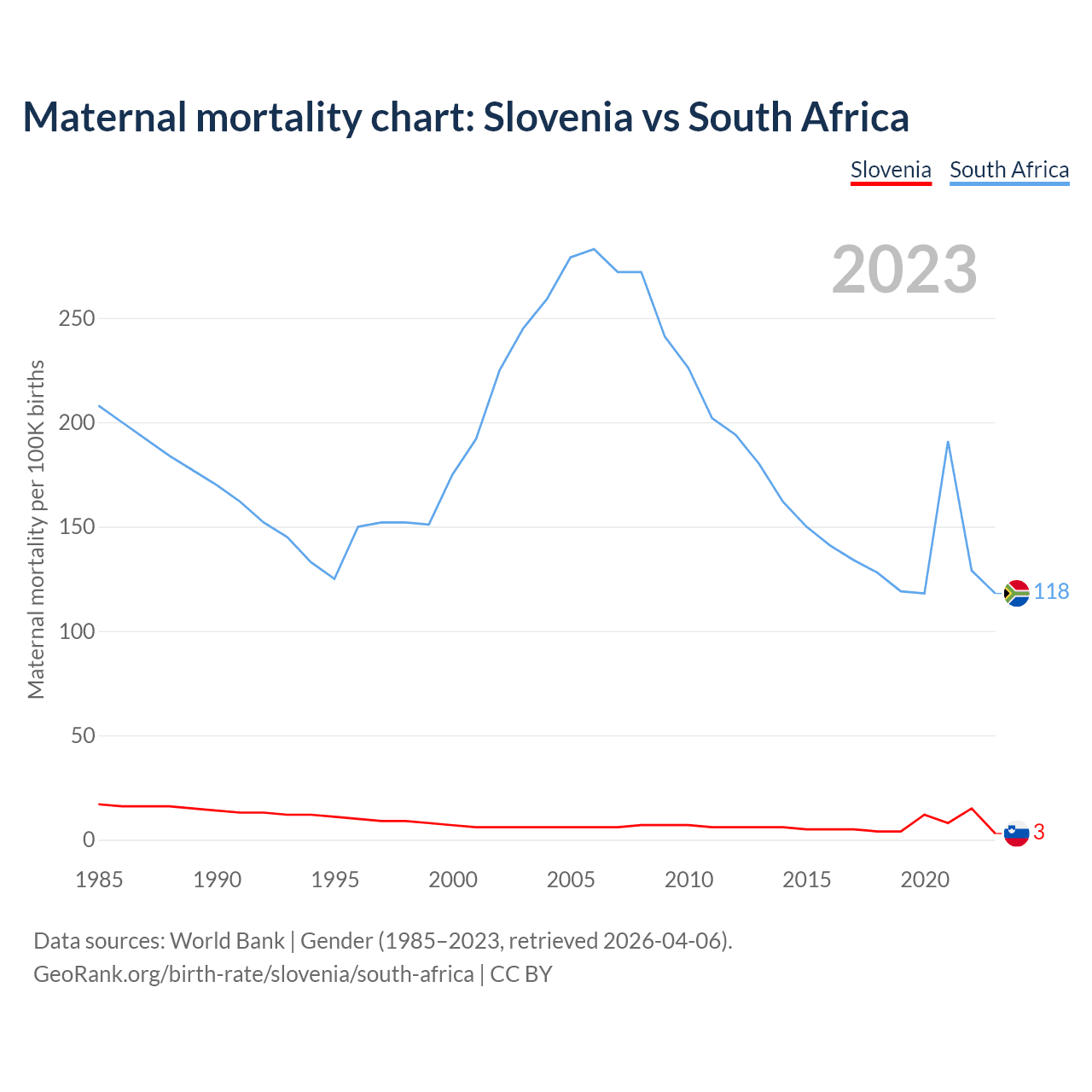The maternal mortality rate, which is the probability of dying during childbirth or within 42 days of pregnancy termination, is 3 deaths per 100,000 live births in Slovenia, compared to 118 deaths in South Africa.