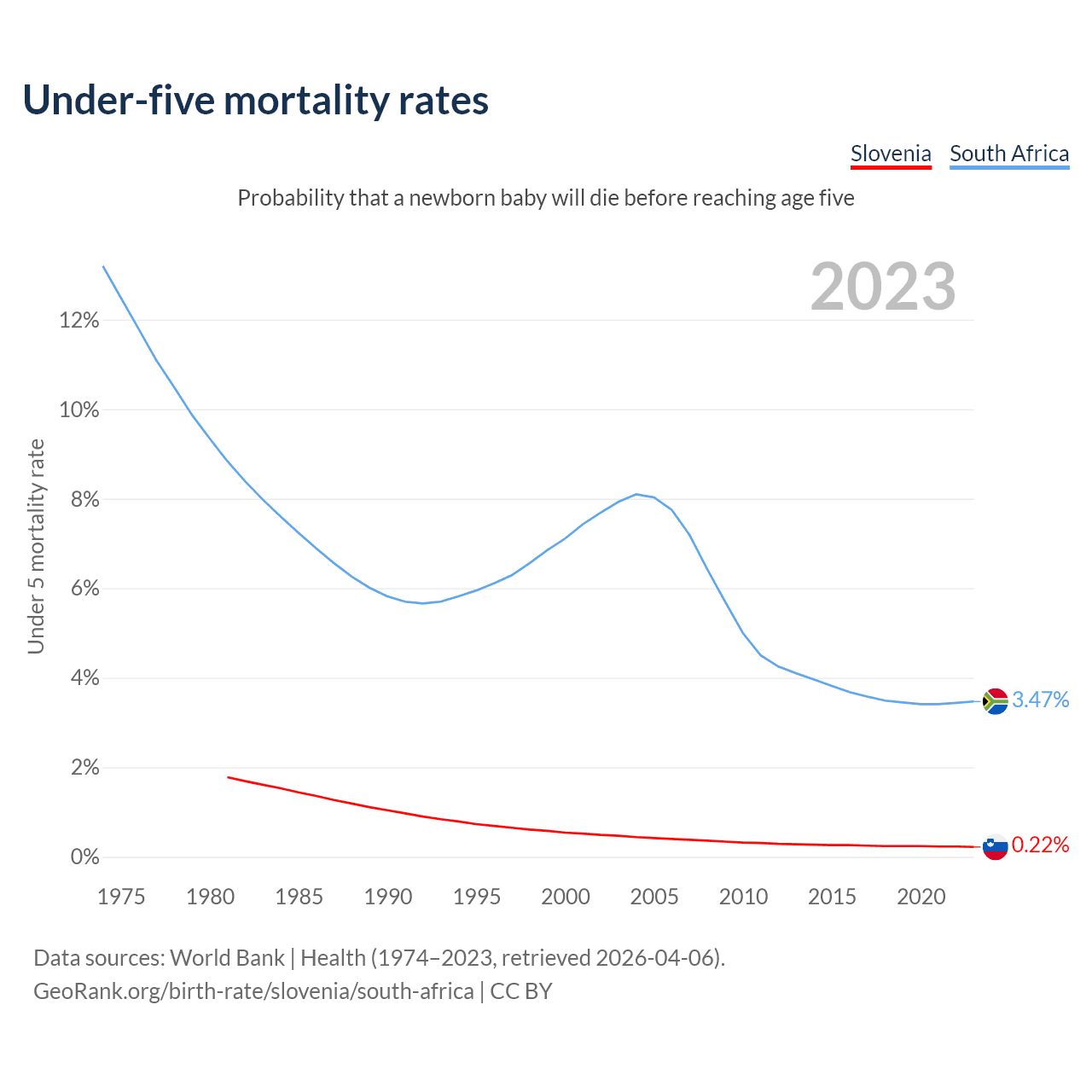 The chance that a newborn baby will die before reaching age five is 0.22% in Slovenia and 3.47% in South Africa. Above is a chart with historical data on under-five mortality rates.