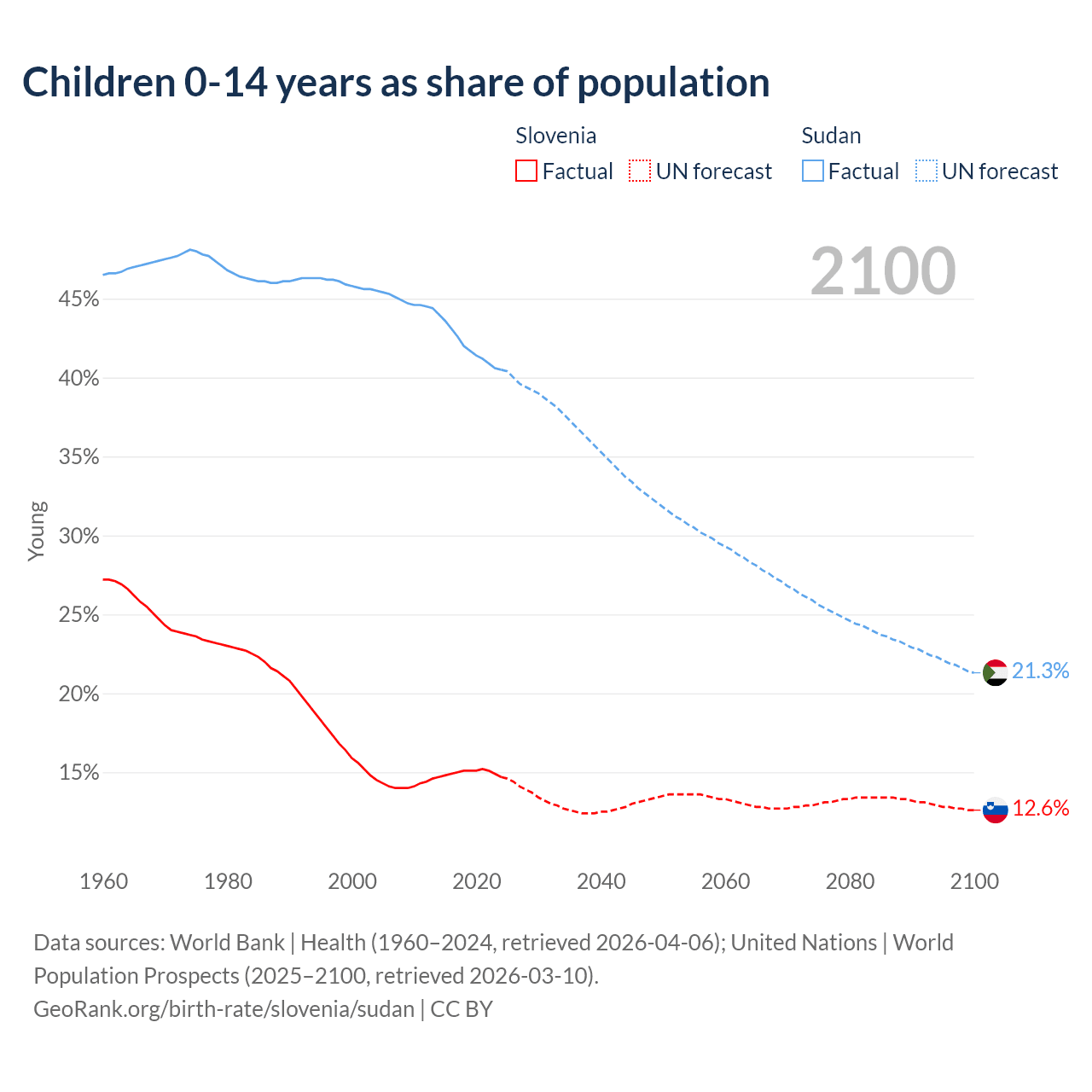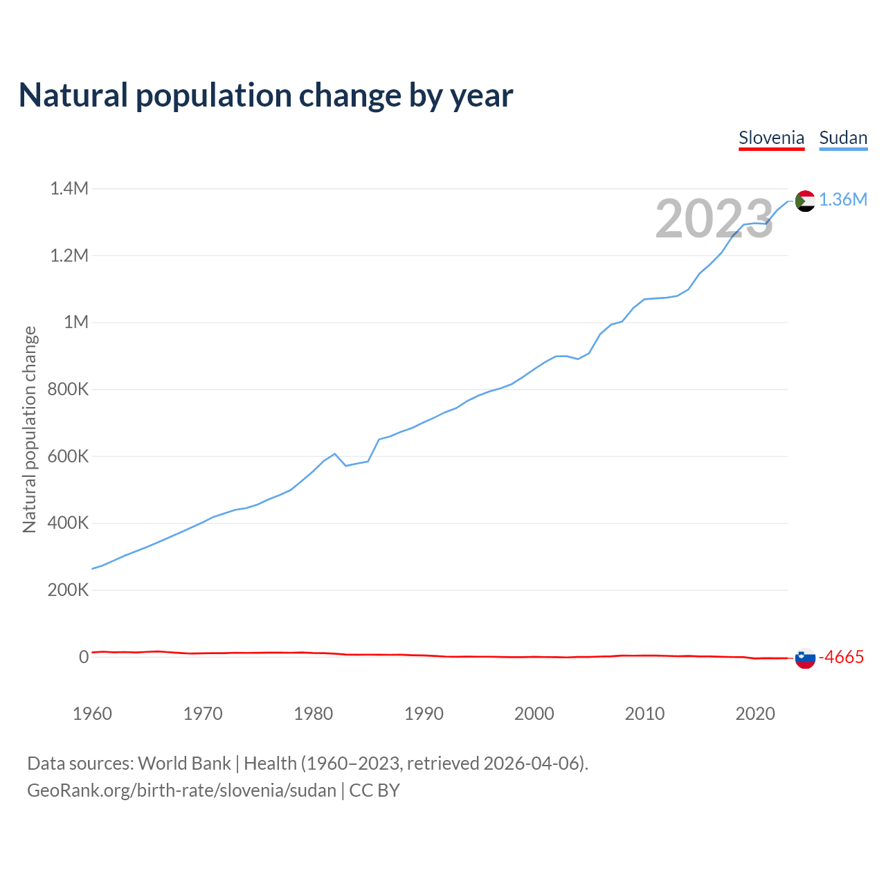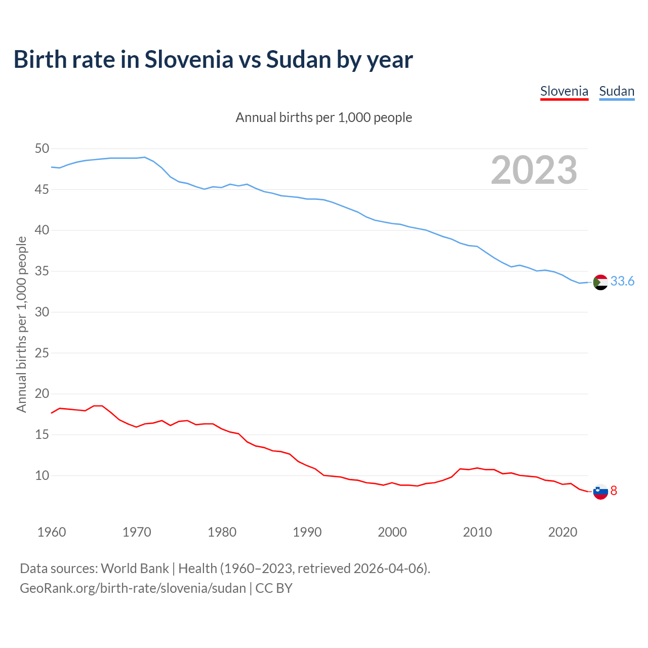 Slovenia has an annual birth rate of 8 births per 1,000 people, compared to 33.6 for Sudan. The average number of children a woman is expected to have during her lifetime — the fertility rate, is 1.51 in Slovenia and 4.32 in Sudan — 186.3% difference.