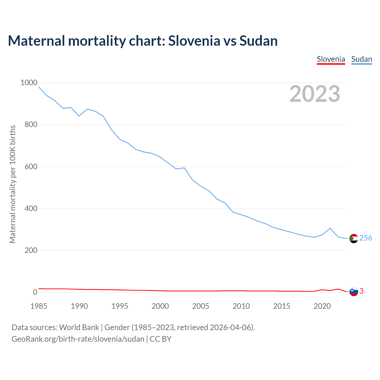 The maternal mortality rate, which is the probability of dying during childbirth or within 42 days of pregnancy termination, is 3 deaths per 100,000 live births in Slovenia, compared to 256 deaths in Sudan.