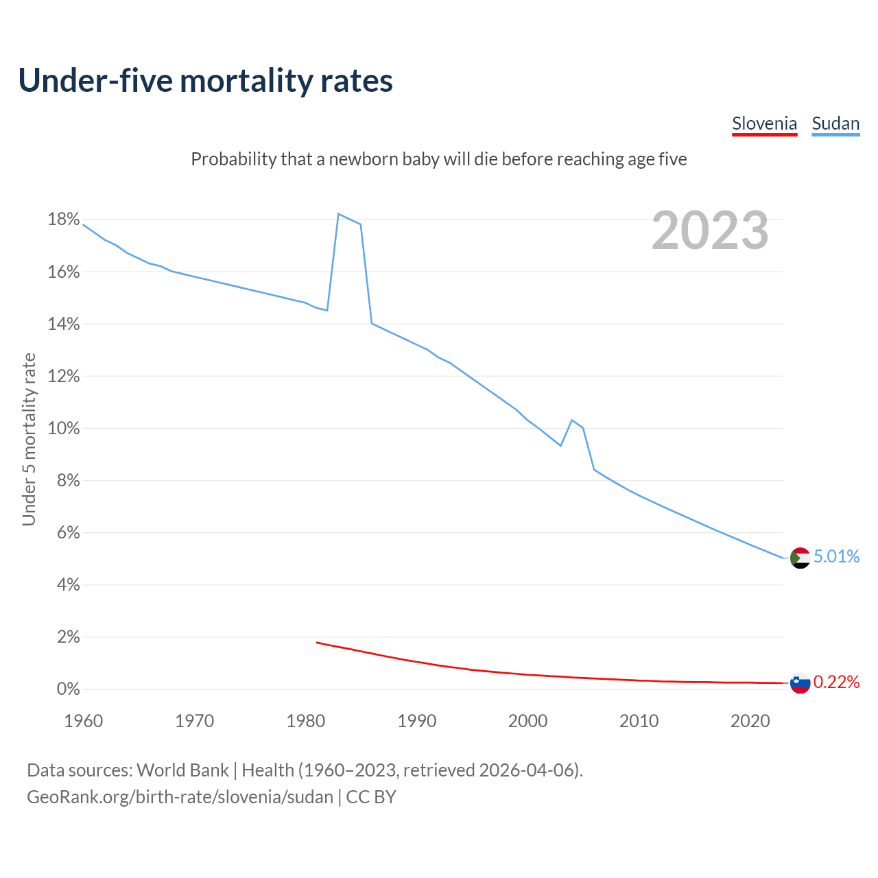 The chance that a newborn baby will die before reaching age five is 0.22% in Slovenia and 5.01% in Sudan. Above is a chart with historical data on under-five mortality rates.