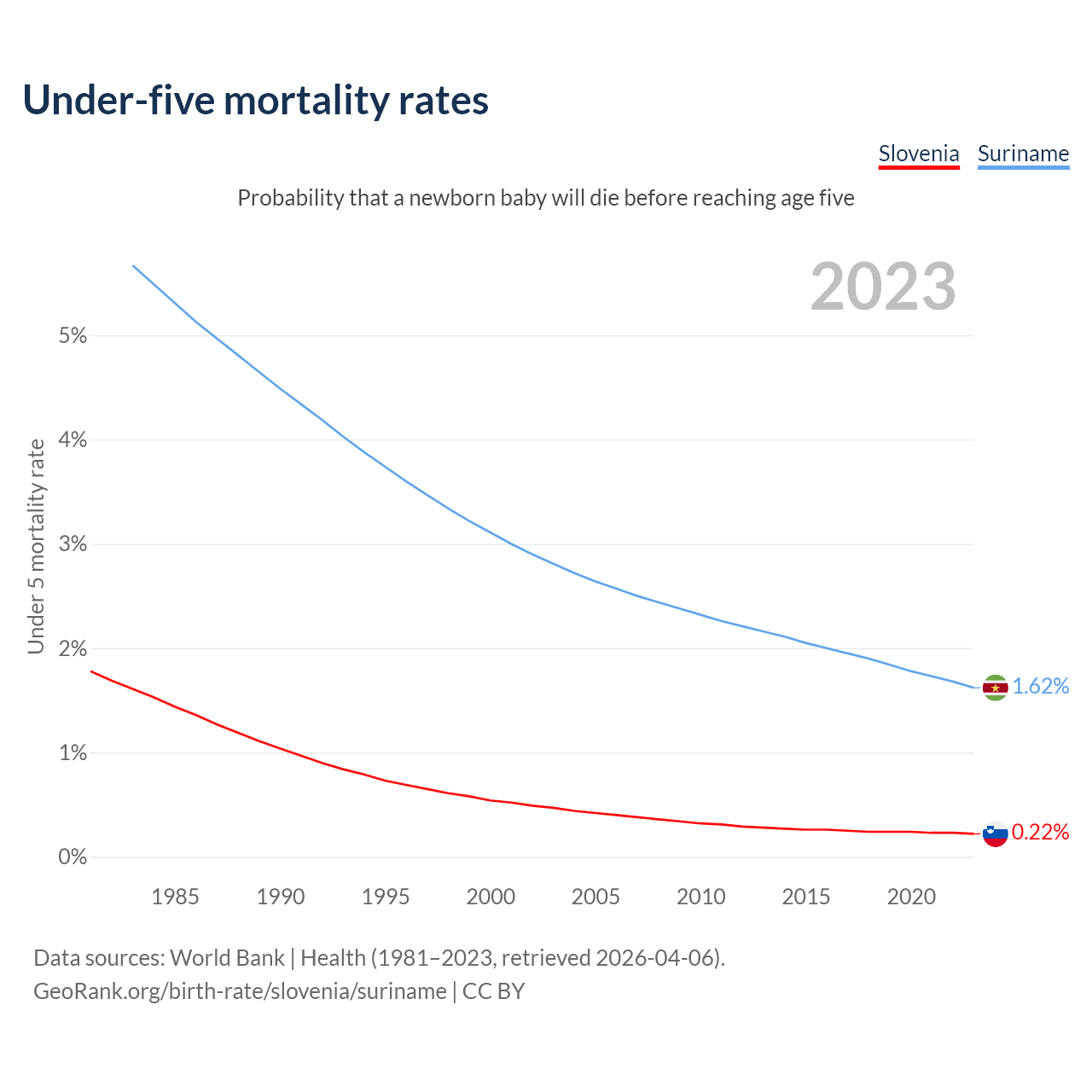 The chance that a newborn baby will die before reaching age five is 0.22% in Slovenia and 1.62% in Suriname. Above is a chart with historical data on under-five mortality rates.