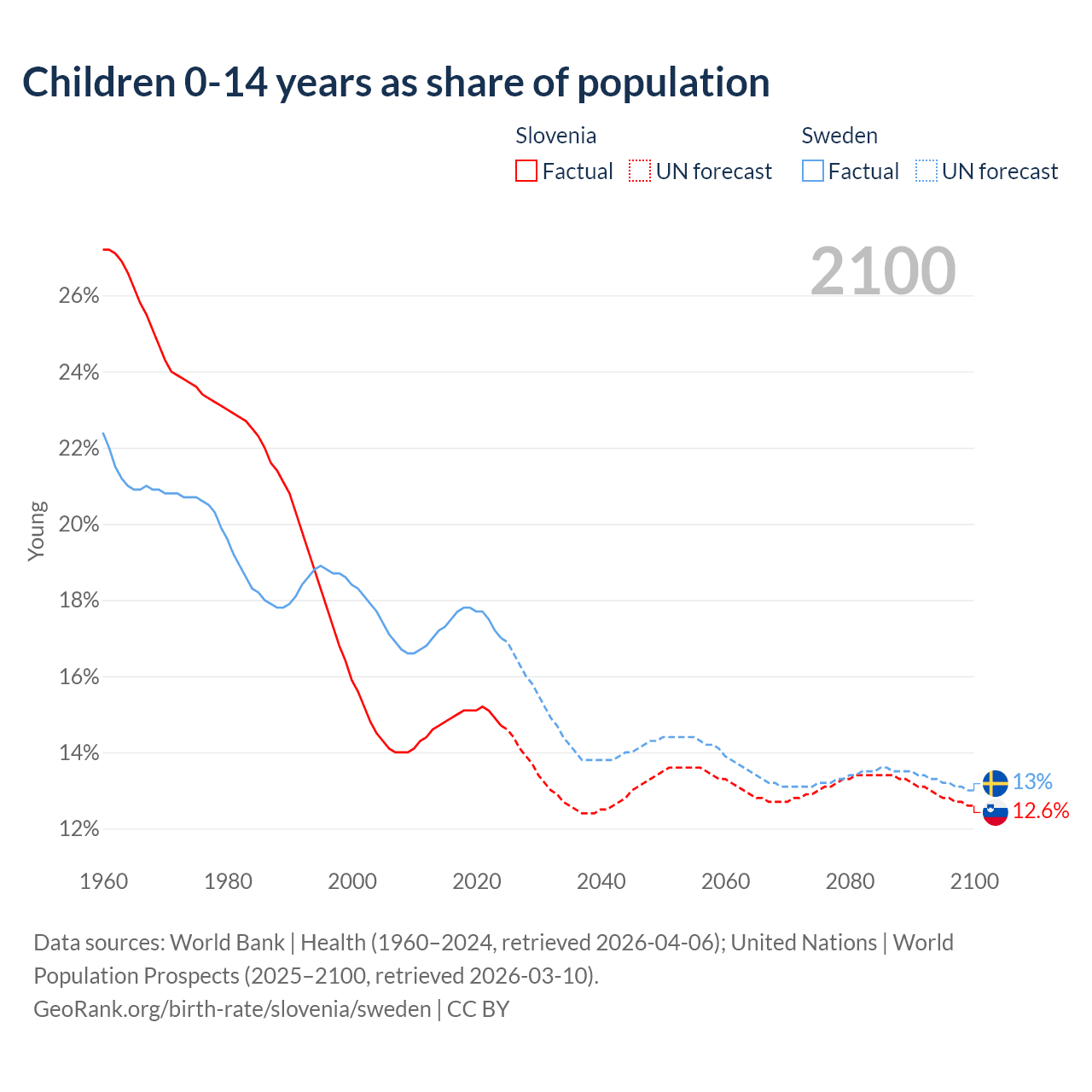According to the latest available data on birth rates, the fertility rate in Slovenia was 1.51 children per woman in 2023, compared to 1.45 in Sweden in 2023. The replacement level is considered to be 2.1 children per woman.
