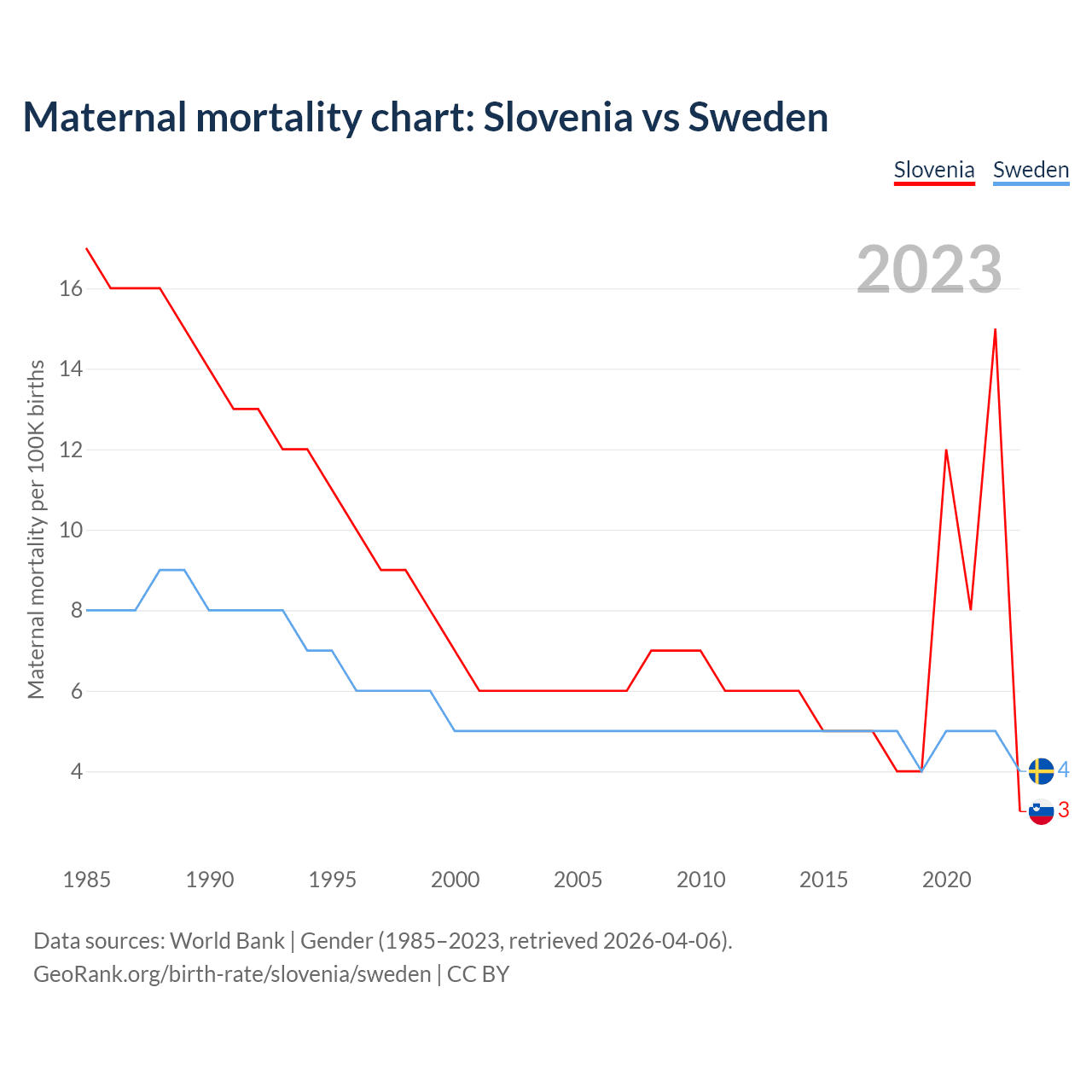 The maternal mortality rate, which is the probability of dying during childbirth or within 42 days of pregnancy termination, is 3 deaths per 100,000 live births in Slovenia, compared to 4 deaths in Sweden.