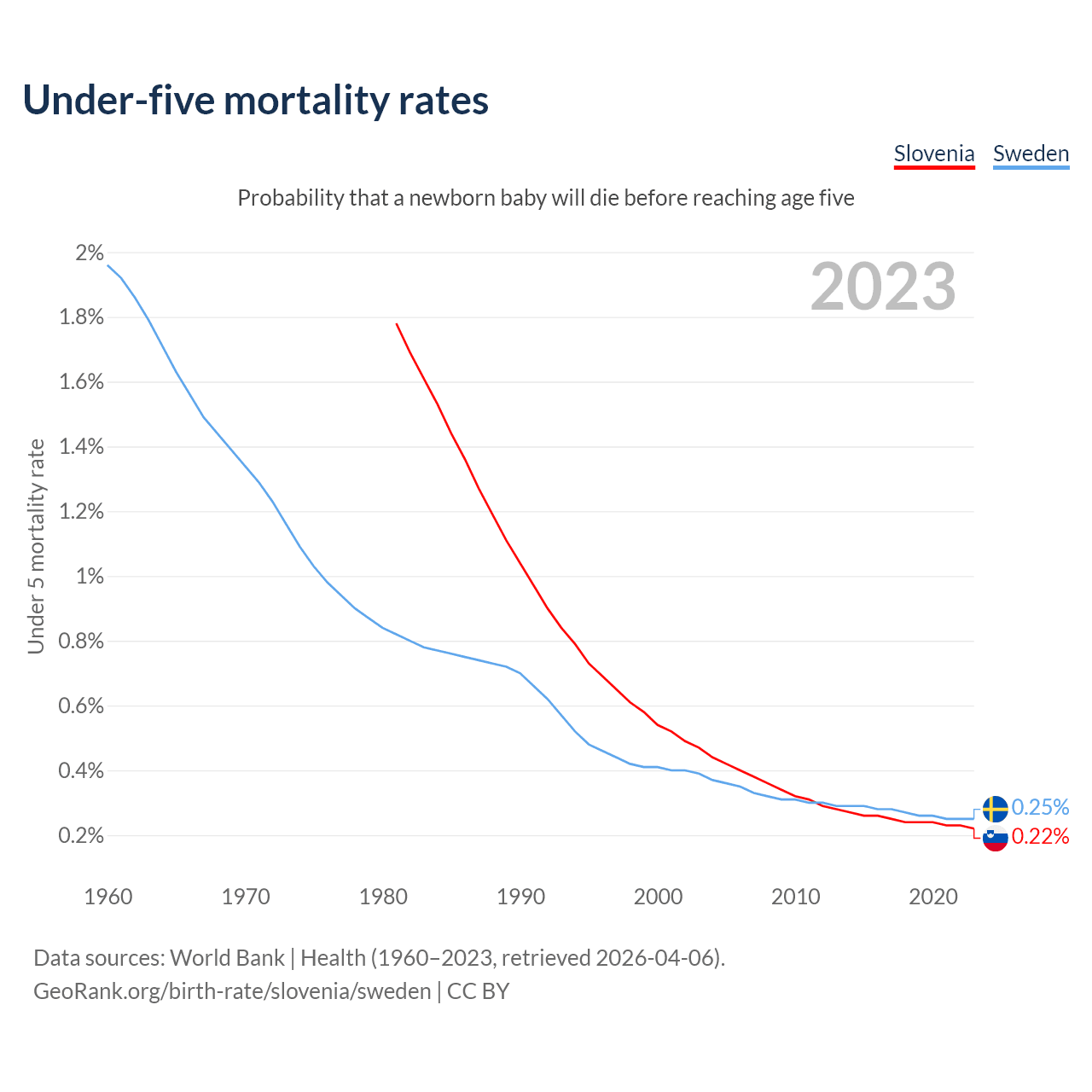 The chance that a newborn baby will die before reaching age five is 0.22% in Slovenia and 0.25% in Sweden. Above is a chart with historical data on under-five mortality rates.