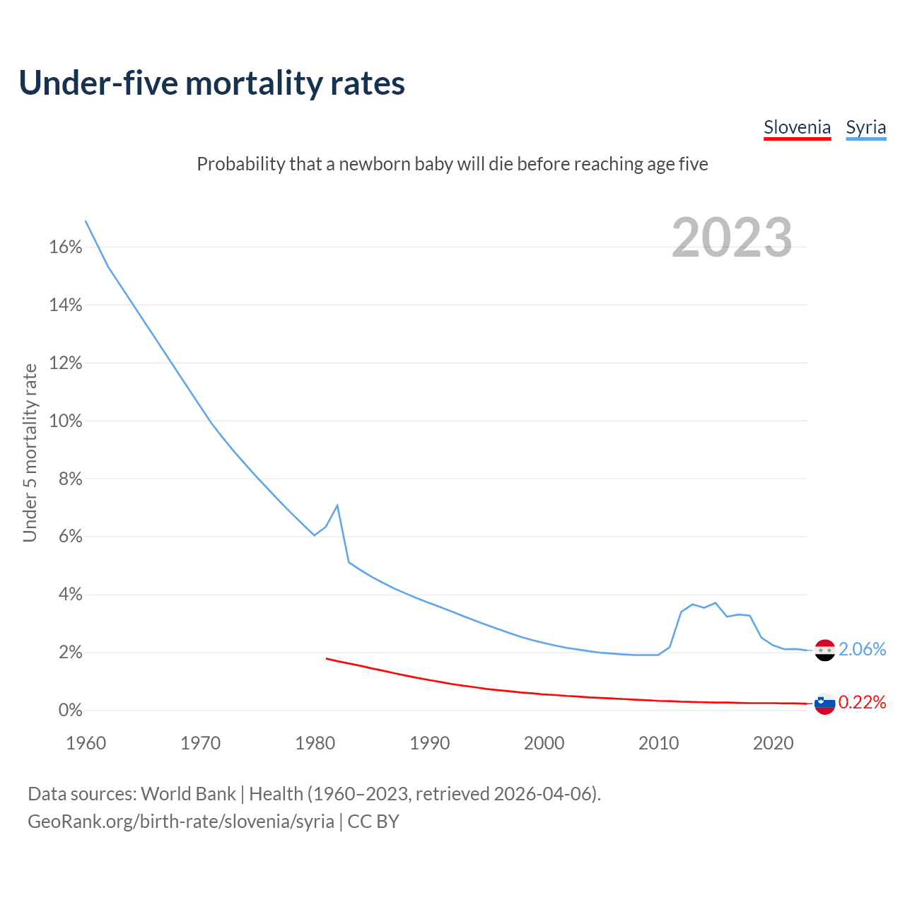 The chance that a newborn baby will die before reaching age five is 0.22% in Slovenia and 2.06% in Syria. Above is a chart with historical data on under-five mortality rates.