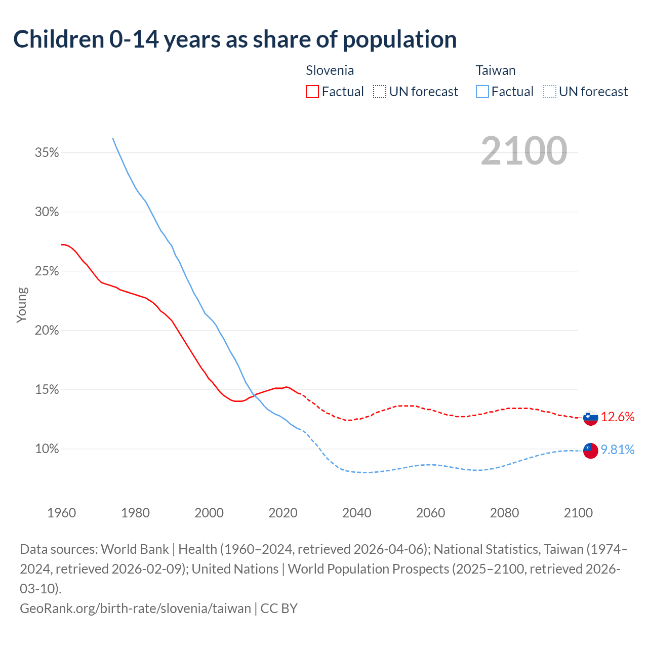 Data sources: World Bank | Health (1960–2024, retrieved 2026-04-06); National Statistics, Taiwan (1974–2024, retrieved 2026-02-09); United Nations | World Population Prospects (2025–2100, retrieved 2026-03-10).