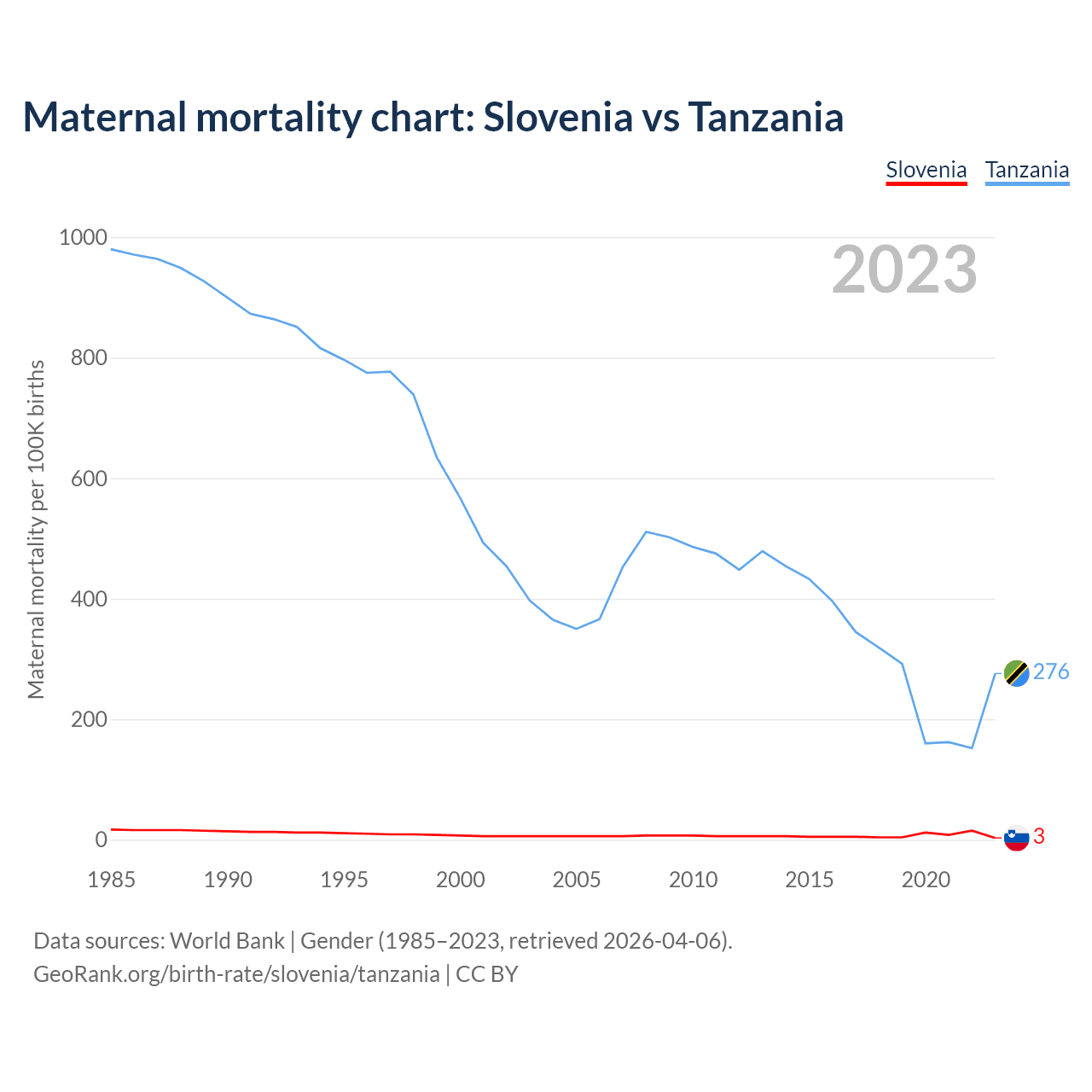 The maternal mortality rate, which is the probability of dying during childbirth or within 42 days of pregnancy termination, is 3 deaths per 100,000 live births in Slovenia, compared to 276 deaths in Tanzania.
