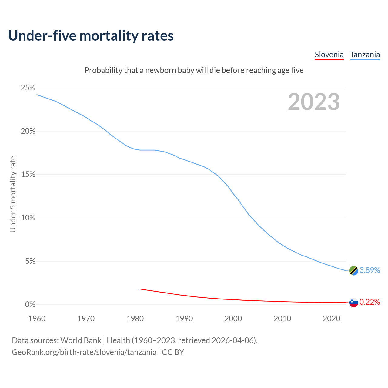 The chance that a newborn baby will die before reaching age five is 0.22% in Slovenia and 3.89% in Tanzania. Above is a chart with historical data on under-five mortality rates.