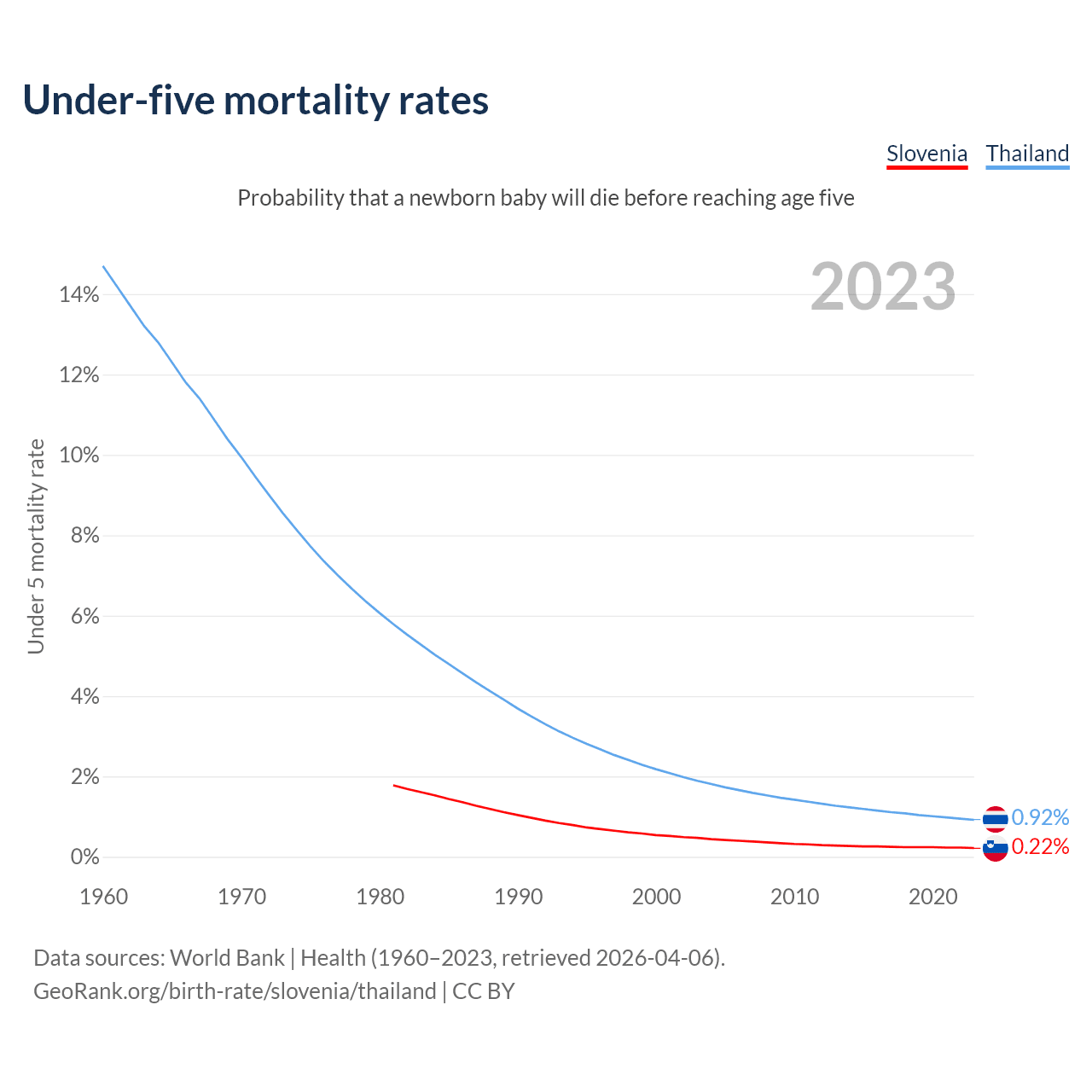 The chance that a newborn baby will die before reaching age five is 0.22% in Slovenia and 0.92% in Thailand. Above is a chart with historical data on under-five mortality rates.