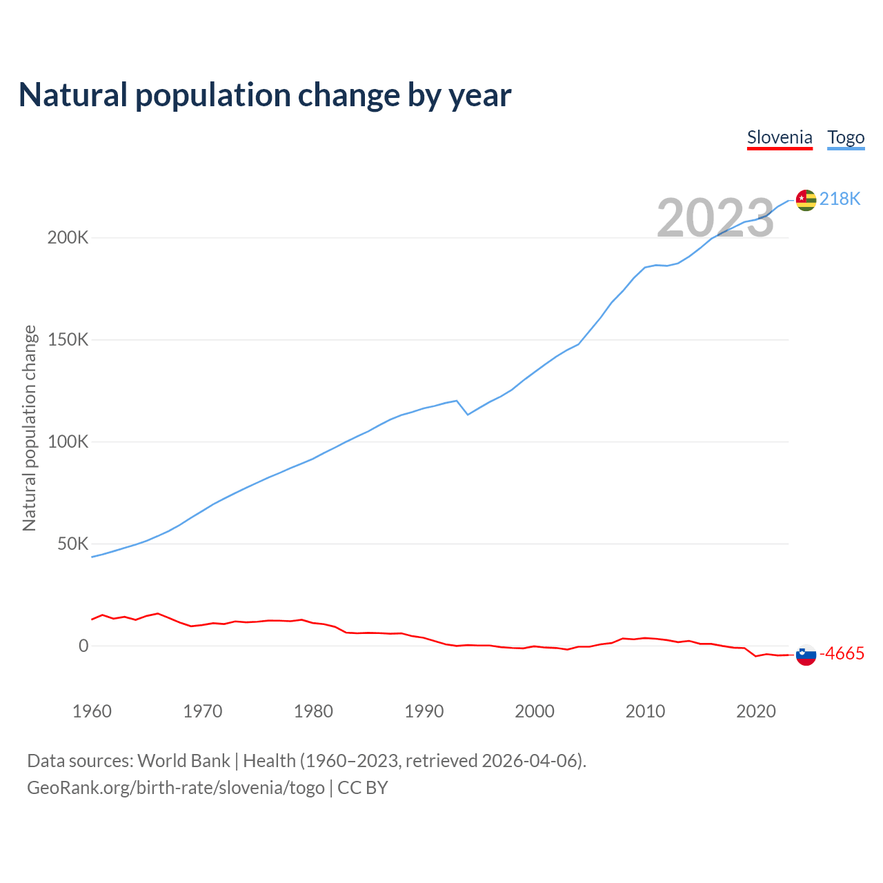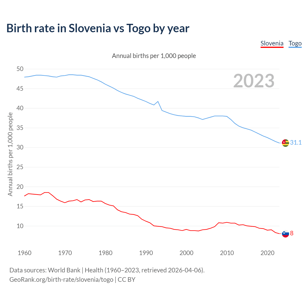 Slovenia has an annual birth rate of 8 births per 1,000 people, compared to 31.1 for Togo. The average number of children a woman is expected to have during her lifetime — the fertility rate, is 1.51 in Slovenia and 4.19 in Togo — 177.6% difference.