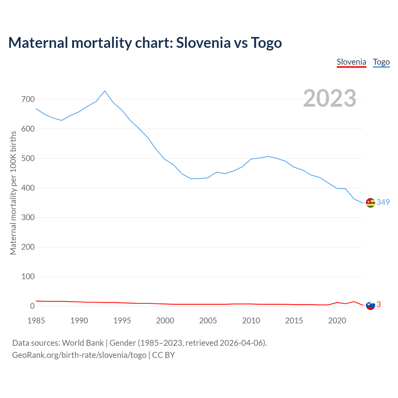 The maternal mortality rate, which is the probability of dying during childbirth or within 42 days of pregnancy termination, is 3 deaths per 100,000 live births in Slovenia, compared to 349 deaths in Togo.