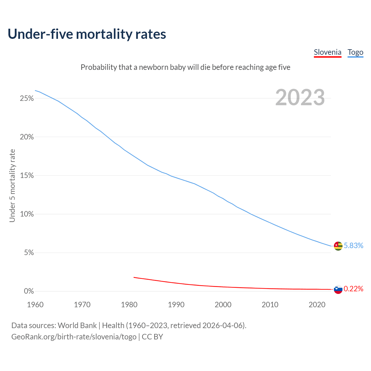 The chance that a newborn baby will die before reaching age five is 0.22% in Slovenia and 5.83% in Togo. Above is a chart with historical data on under-five mortality rates.