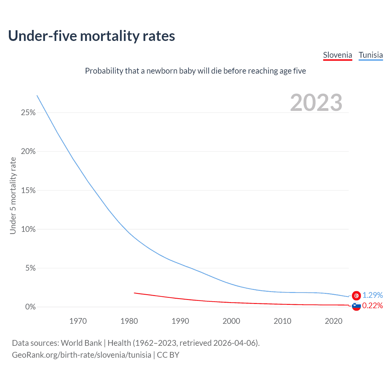 The chance that a newborn baby will die before reaching age five is 0.22% in Slovenia and 1.29% in Tunisia. Above is a chart with historical data on under-five mortality rates.