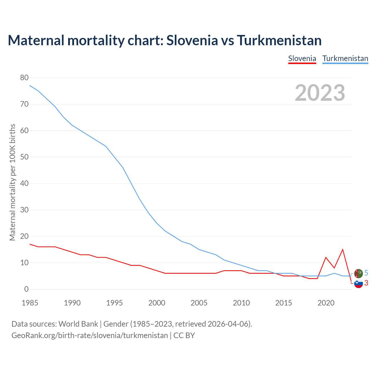 The maternal mortality rate, which is the probability of dying during childbirth or within 42 days of pregnancy termination, is 3 deaths per 100,000 live births in Slovenia, compared to 5 deaths in Turkmenistan.