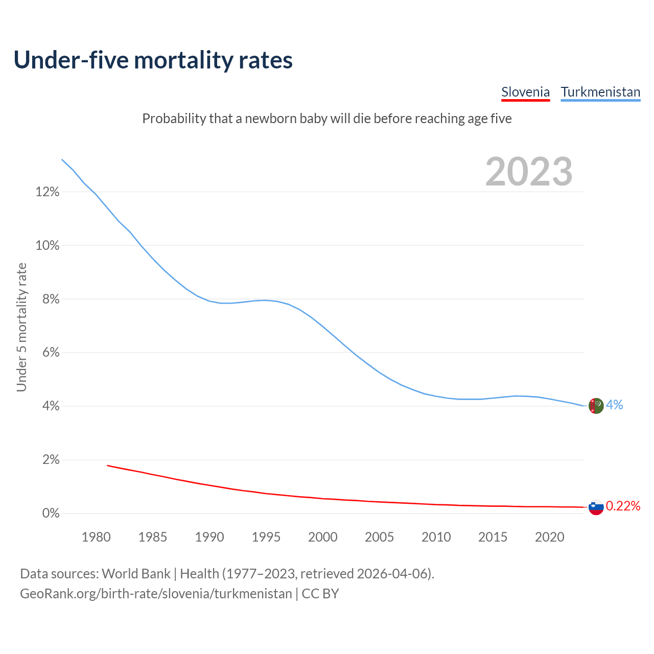 The chance that a newborn baby will die before reaching age five is 0.22% in Slovenia and 4% in Turkmenistan. Above is a chart with historical data on under-five mortality rates.