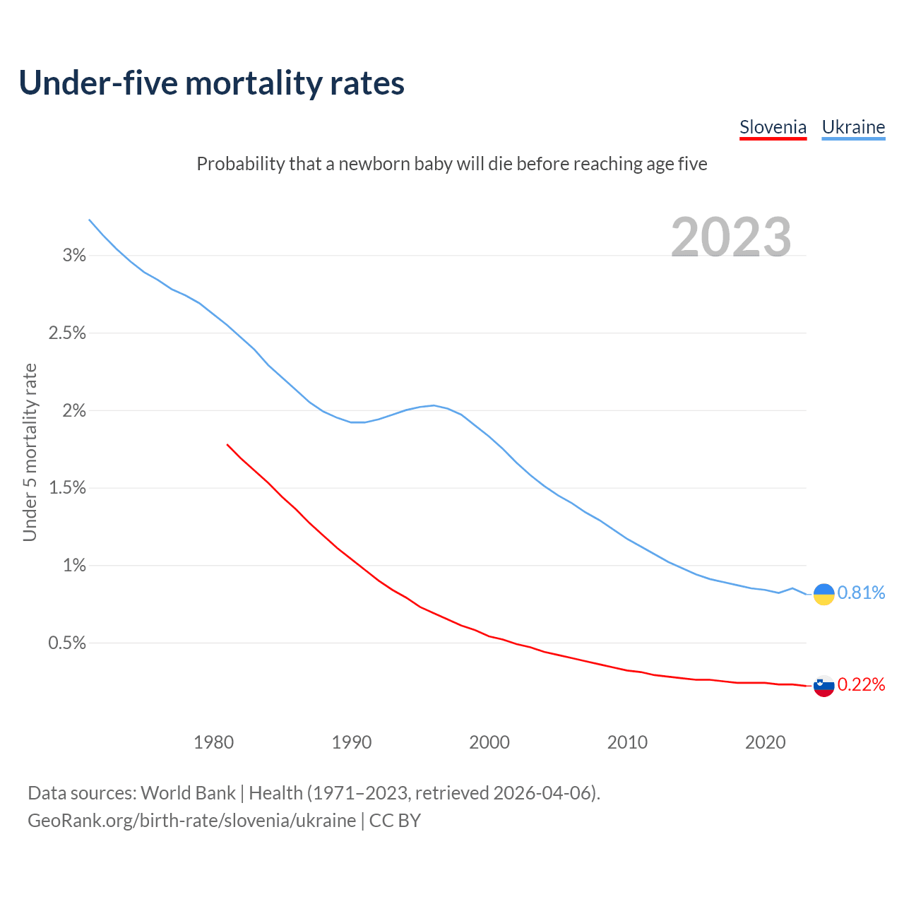 The chance that a newborn baby will die before reaching age five is 0.22% in Slovenia and 0.81% in Ukraine. Above is a chart with historical data on under-five mortality rates.