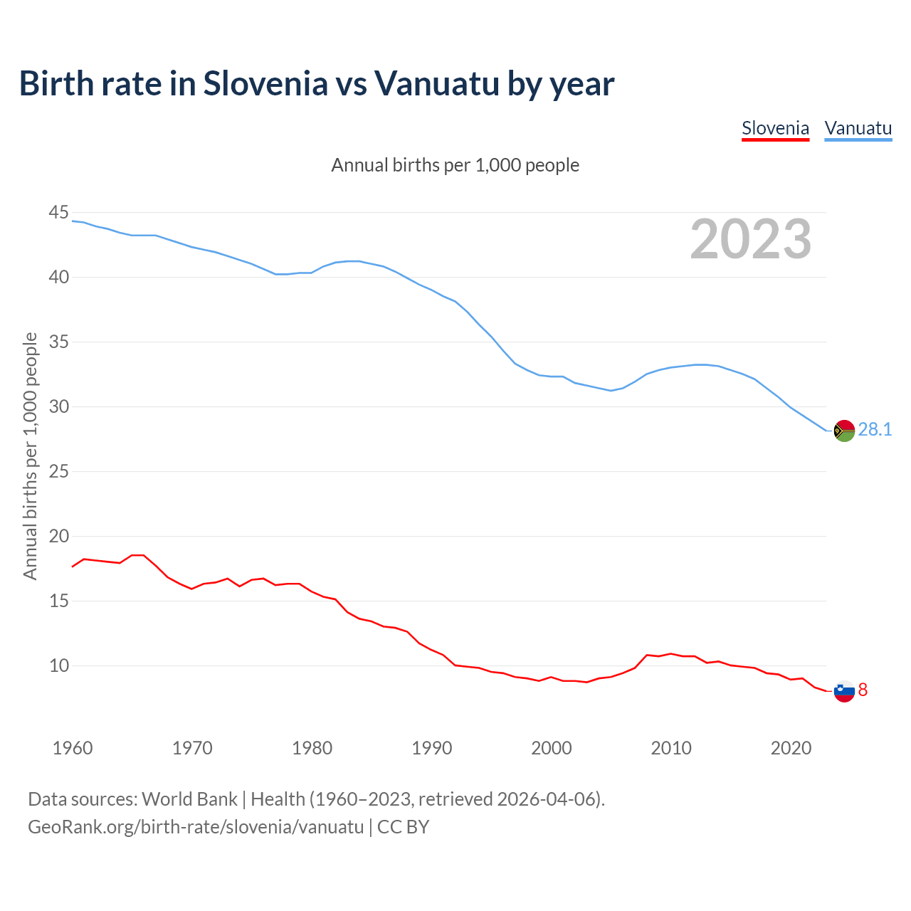 Slovenia has an annual birth rate of 8 births per 1,000 people, compared to 28.1 for Vanuatu. The average number of children a woman is expected to have during her lifetime — the fertility rate, is 1.51 in Slovenia and 3.6 in Vanuatu — 138.1% difference.