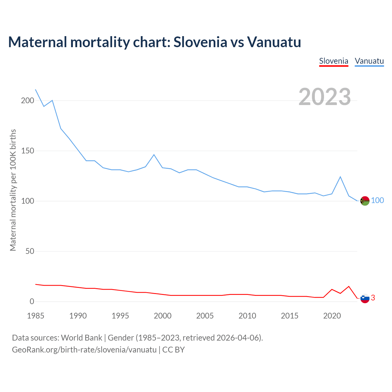 The maternal mortality rate, which is the probability of dying during childbirth or within 42 days of pregnancy termination, is 3 deaths per 100,000 live births in Slovenia, compared to 100 deaths in Vanuatu.