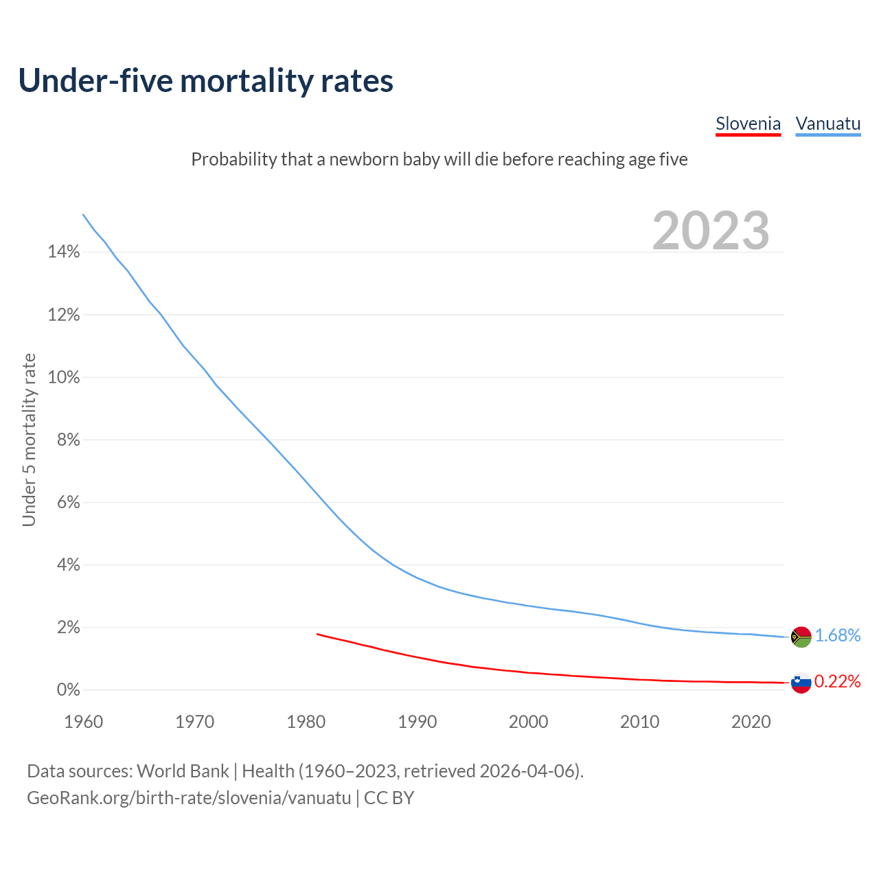 The chance that a newborn baby will die before reaching age five is 0.22% in Slovenia and 1.68% in Vanuatu. Above is a chart with historical data on under-five mortality rates.