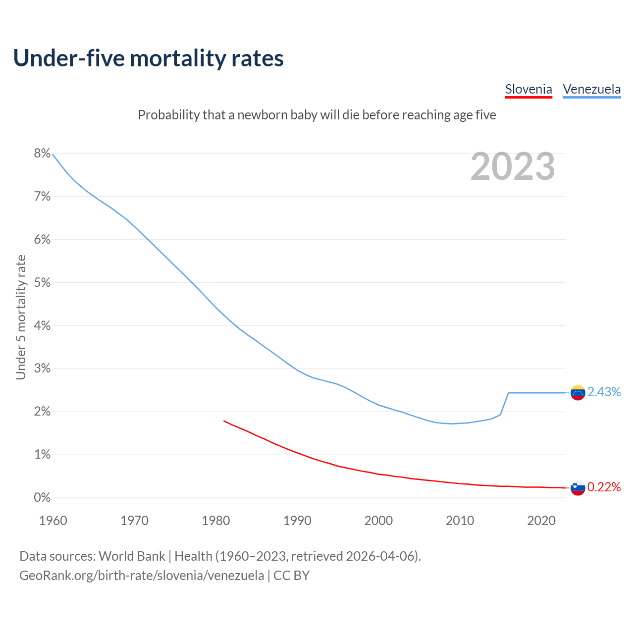 The chance that a newborn baby will die before reaching age five is 0.22% in Slovenia and 2.43% in Venezuela. Above is a chart with historical data on under-five mortality rates.