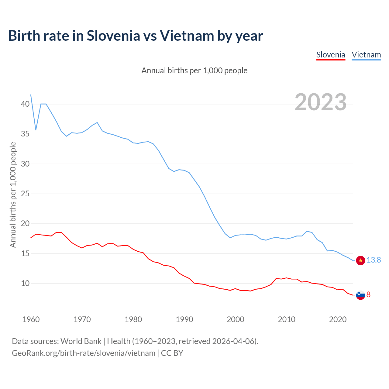 Slovenia has an annual birth rate of 8 births per 1,000 people, compared to 13.8 for Vietnam. The average number of children a woman is expected to have during her lifetime — the fertility rate, is 1.51 in Slovenia and 1.91 in Vietnam — 26.7% difference.