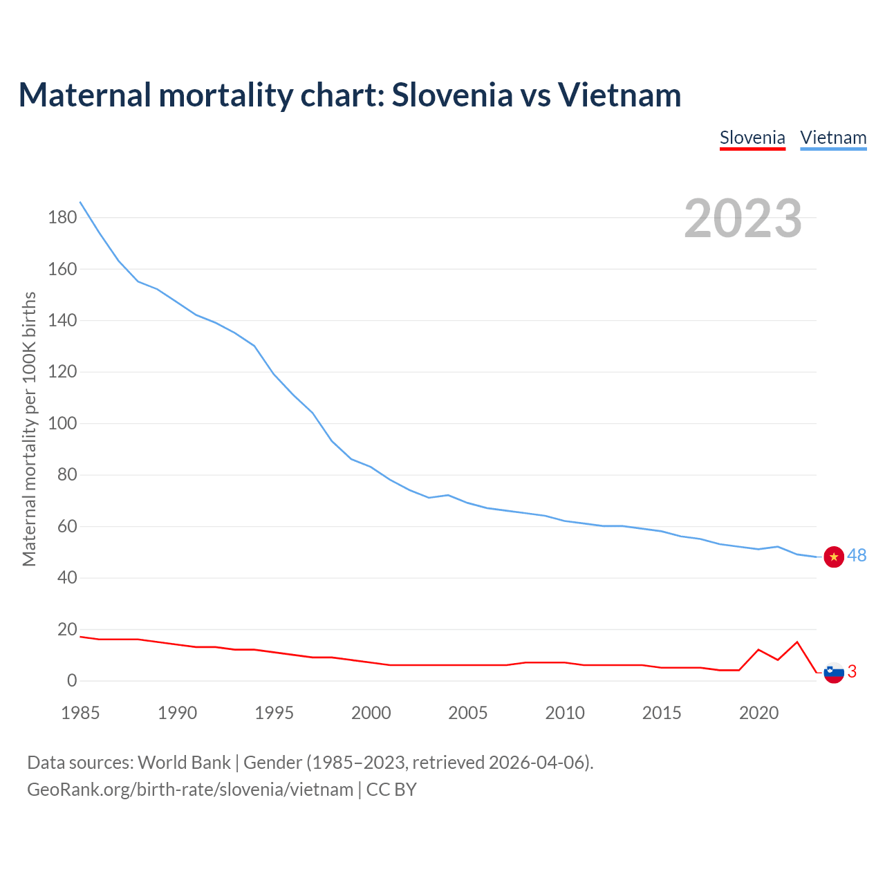 The maternal mortality rate, which is the probability of dying during childbirth or within 42 days of pregnancy termination, is 3 deaths per 100,000 live births in Slovenia, compared to 48 deaths in Vietnam.