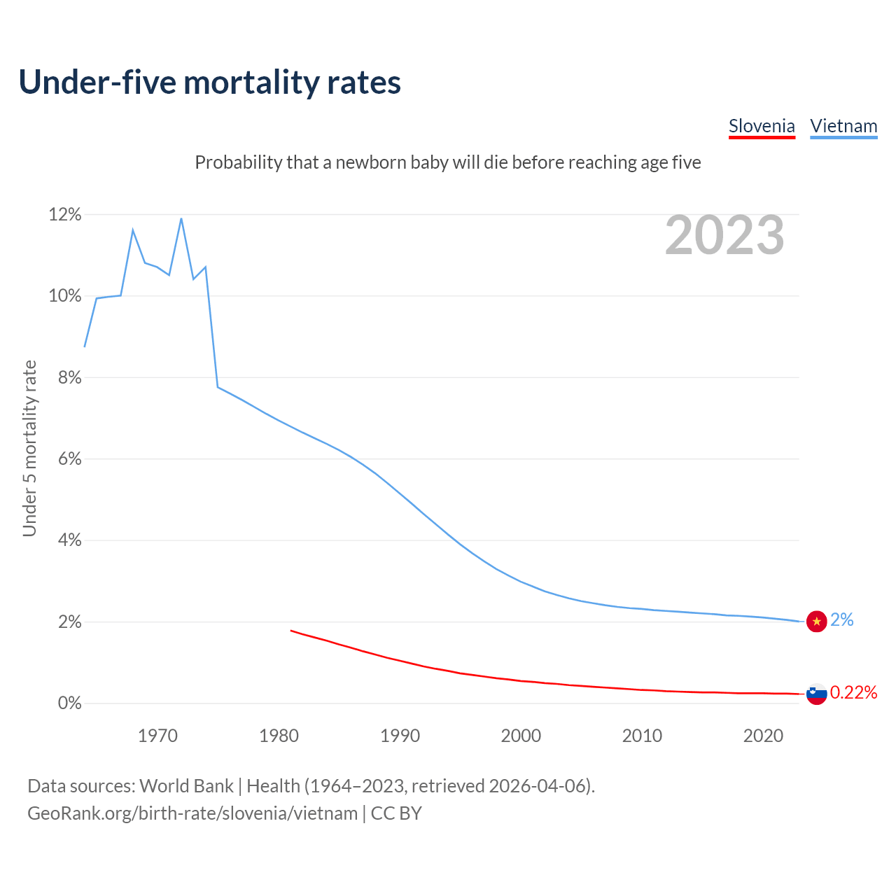 The chance that a newborn baby will die before reaching age five is 0.22% in Slovenia and 2% in Vietnam. Above is a chart with historical data on under-five mortality rates.