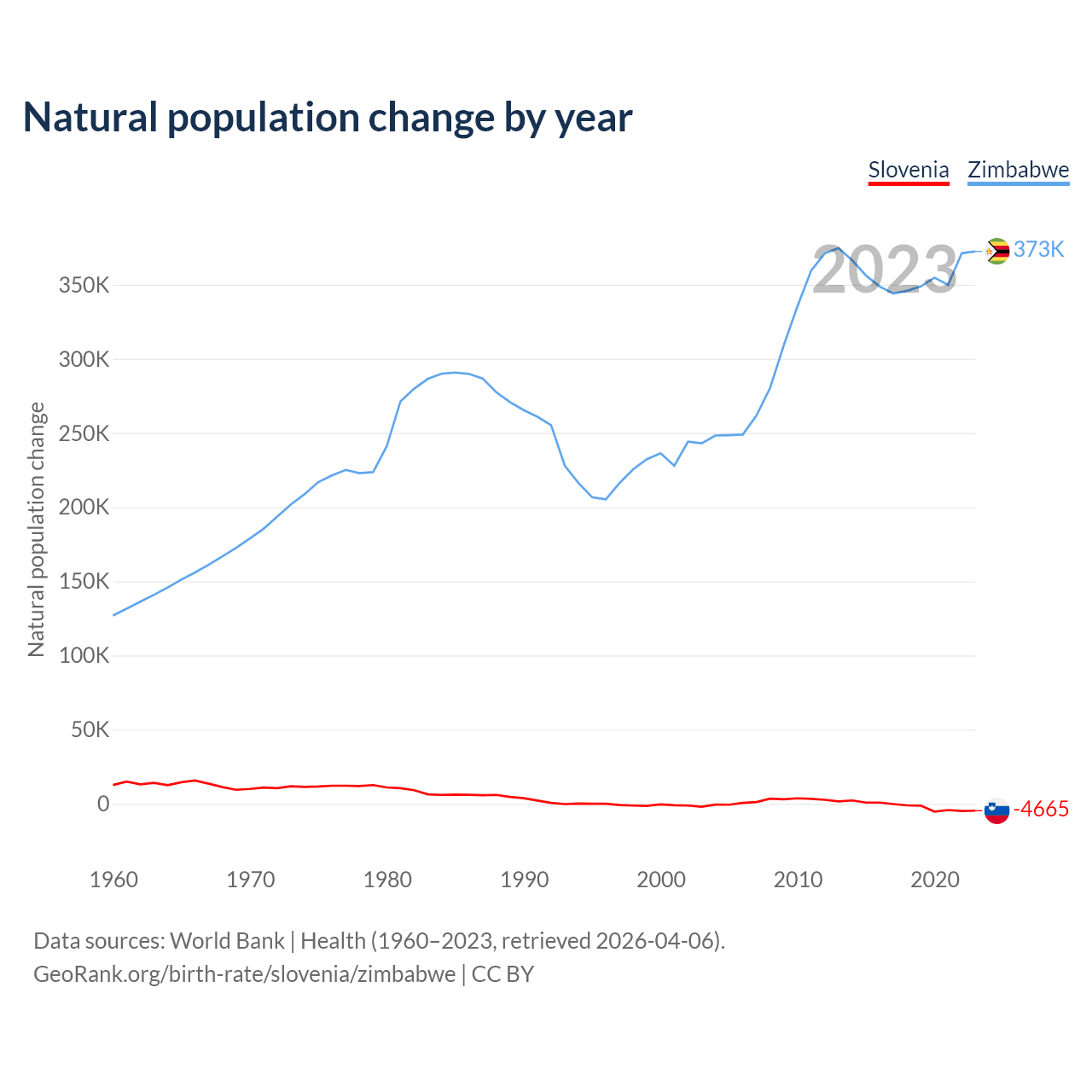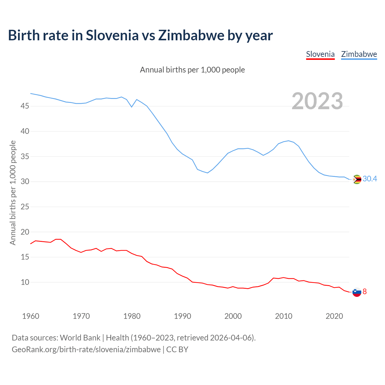 Slovenia has an annual birth rate of 8 births per 1,000 people, compared to 30.4 for Zimbabwe. The average number of children a woman is expected to have during her lifetime — the fertility rate, is 1.51 in Slovenia and 3.72 in Zimbabwe — 146.6% difference.