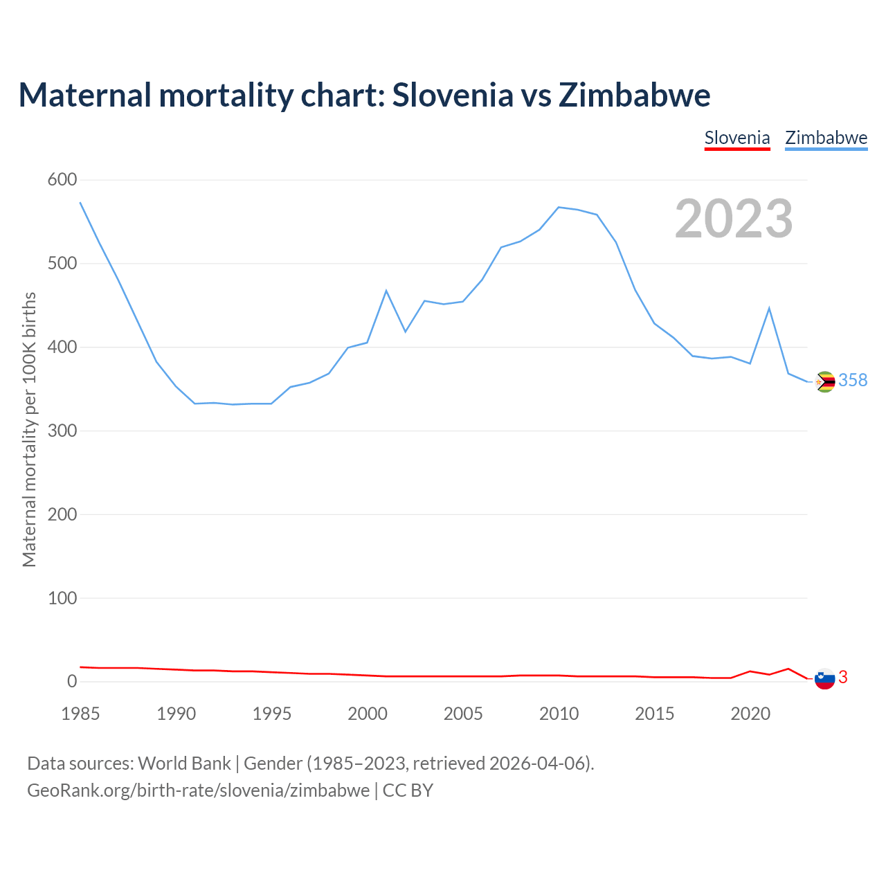 The maternal mortality rate, which is the probability of dying during childbirth or within 42 days of pregnancy termination, is 3 deaths per 100,000 live births in Slovenia, compared to 358 deaths in Zimbabwe.